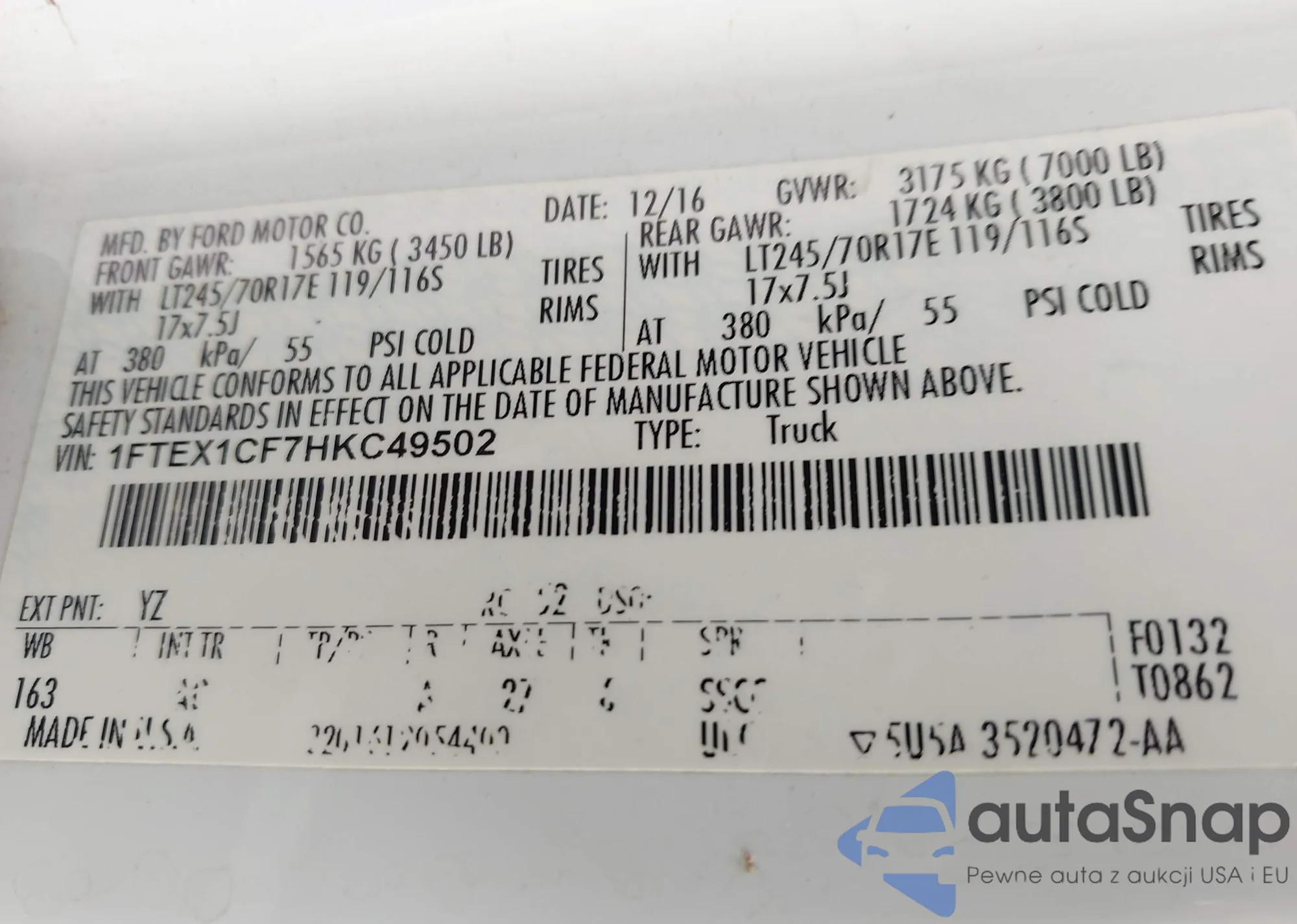 LOT: 42229888 VIN: 1FTEX1CF7HKC49502