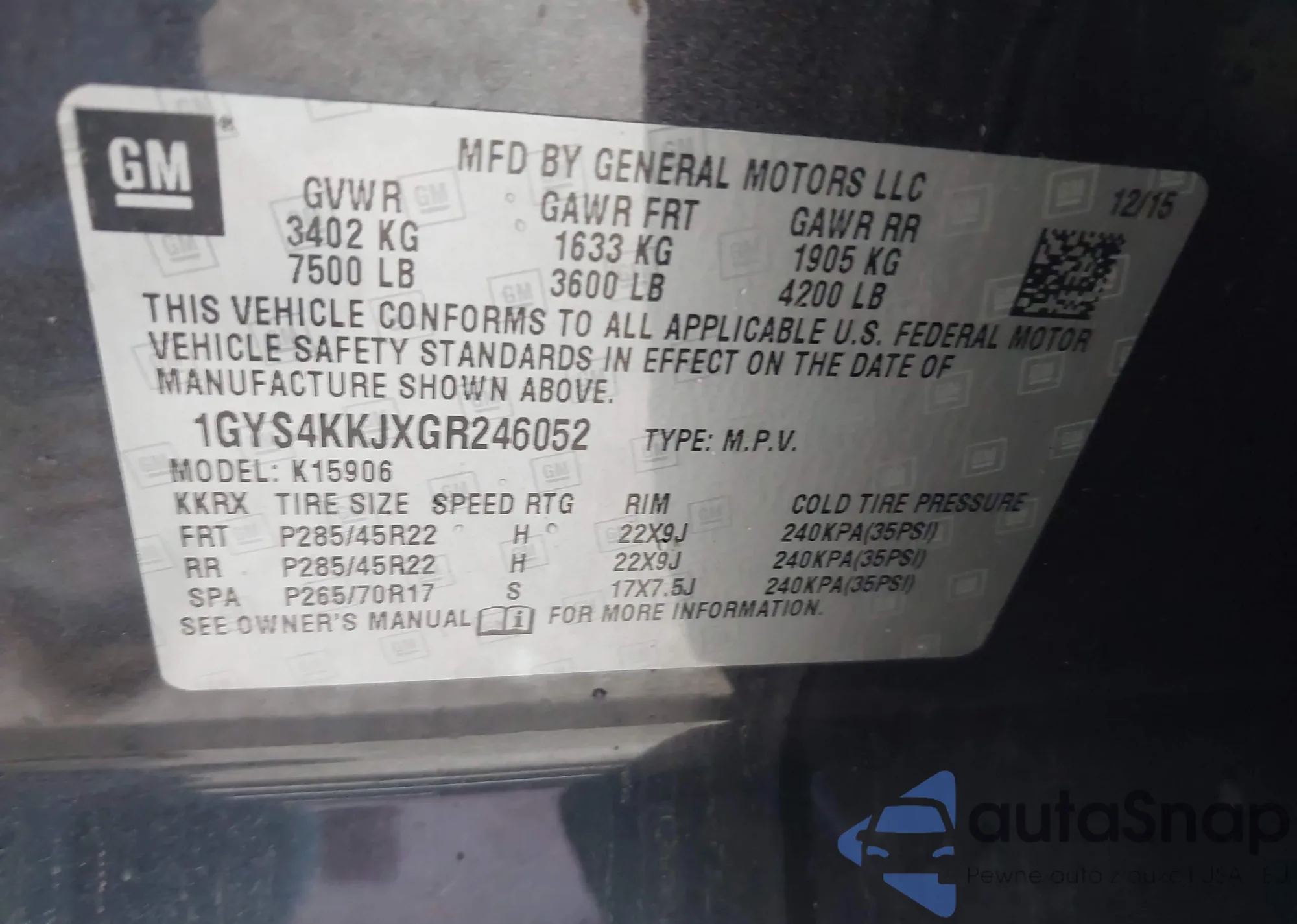 • VIN 1GYS4KKJXGR246052