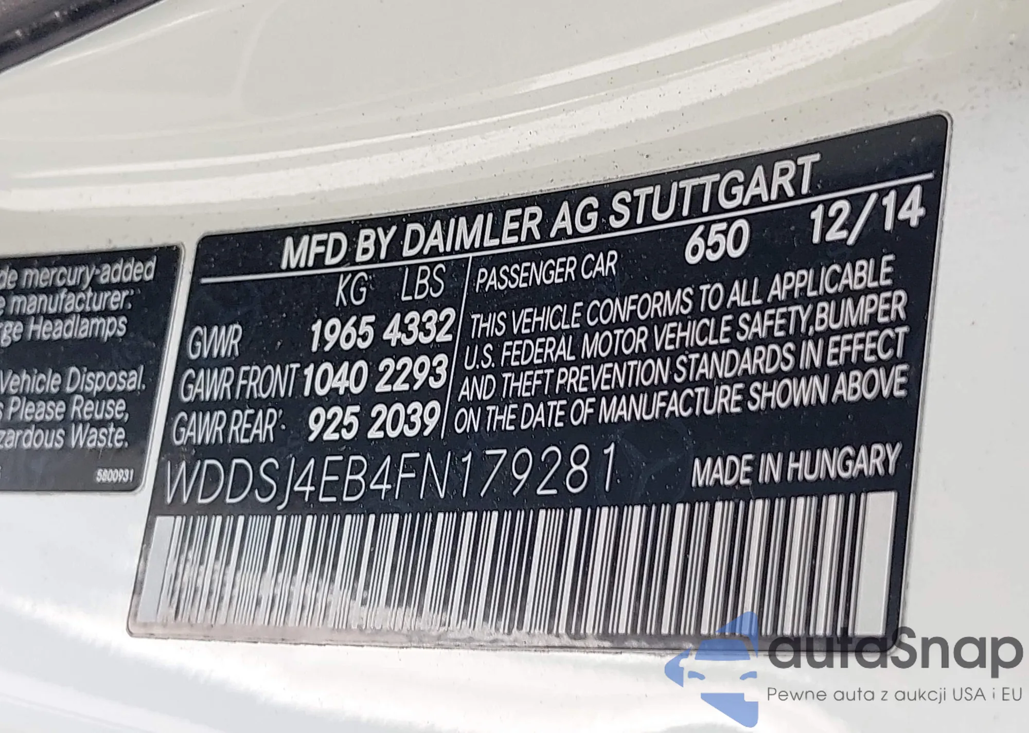 LOT: 42428662 VIN: WDDSJ4EB4FN179281