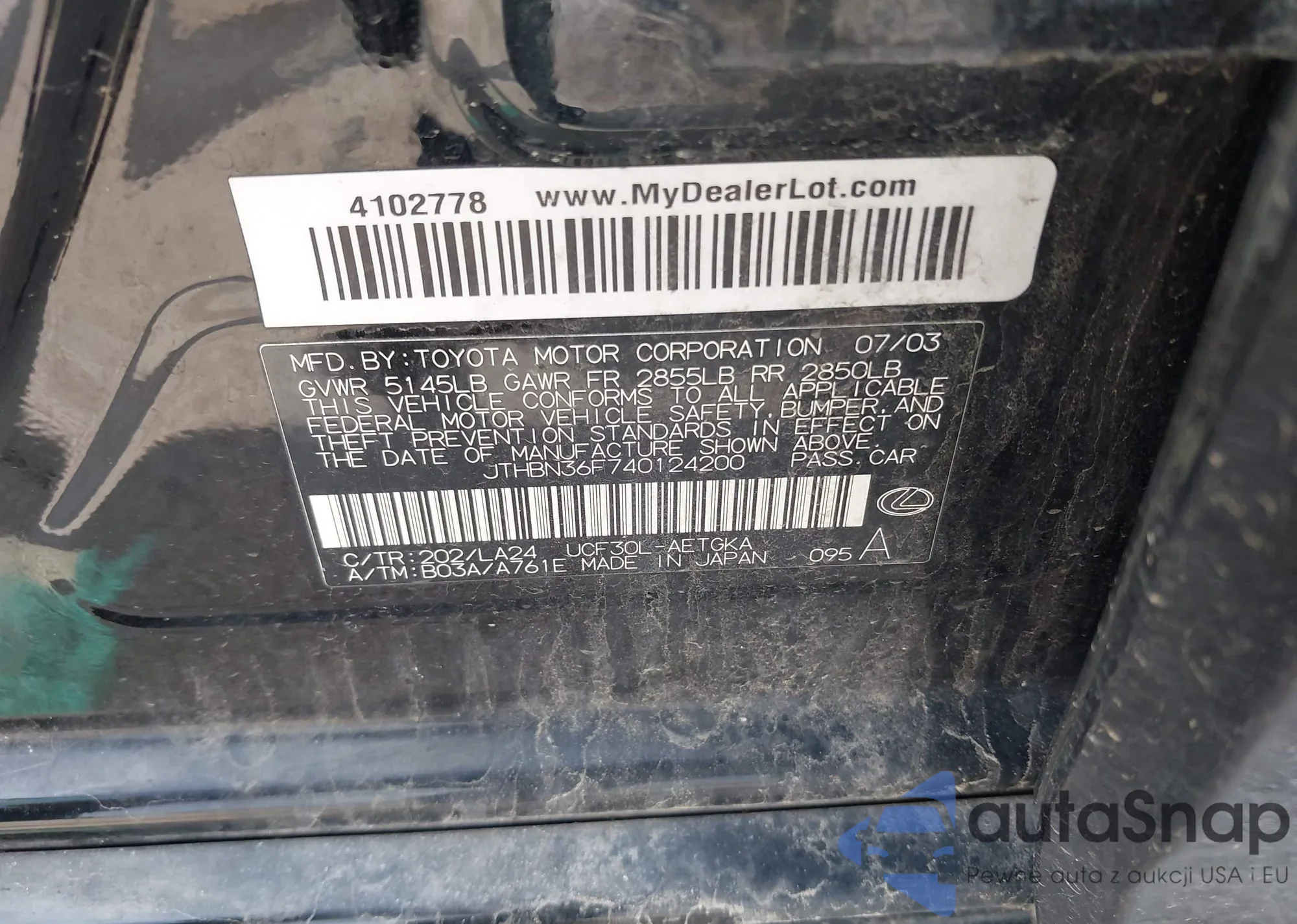 LOT: 42146256 VIN: JTHBN36F740124200