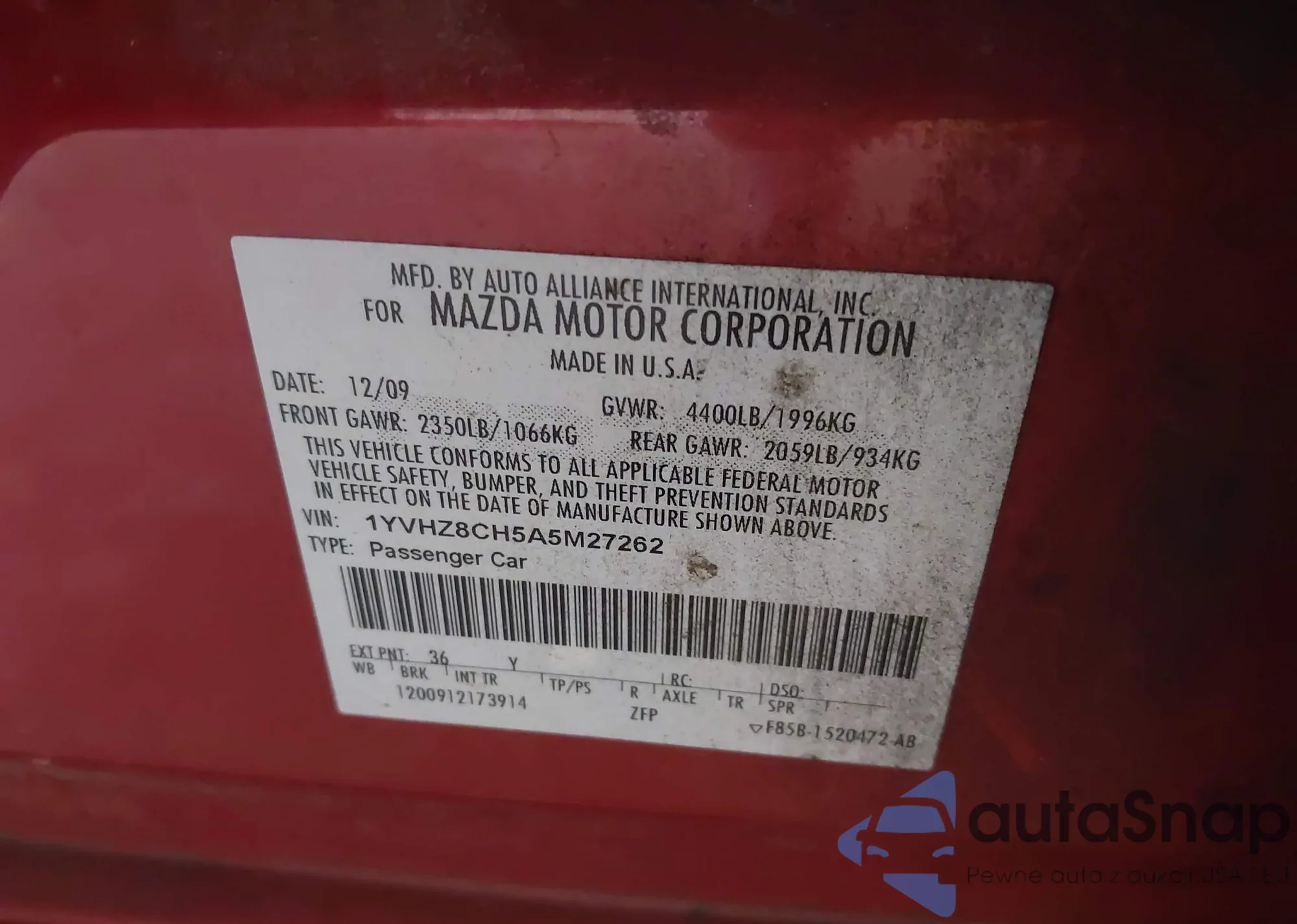 LOT: 42151673 VIN: 1YVHZ8CH5A5M27262