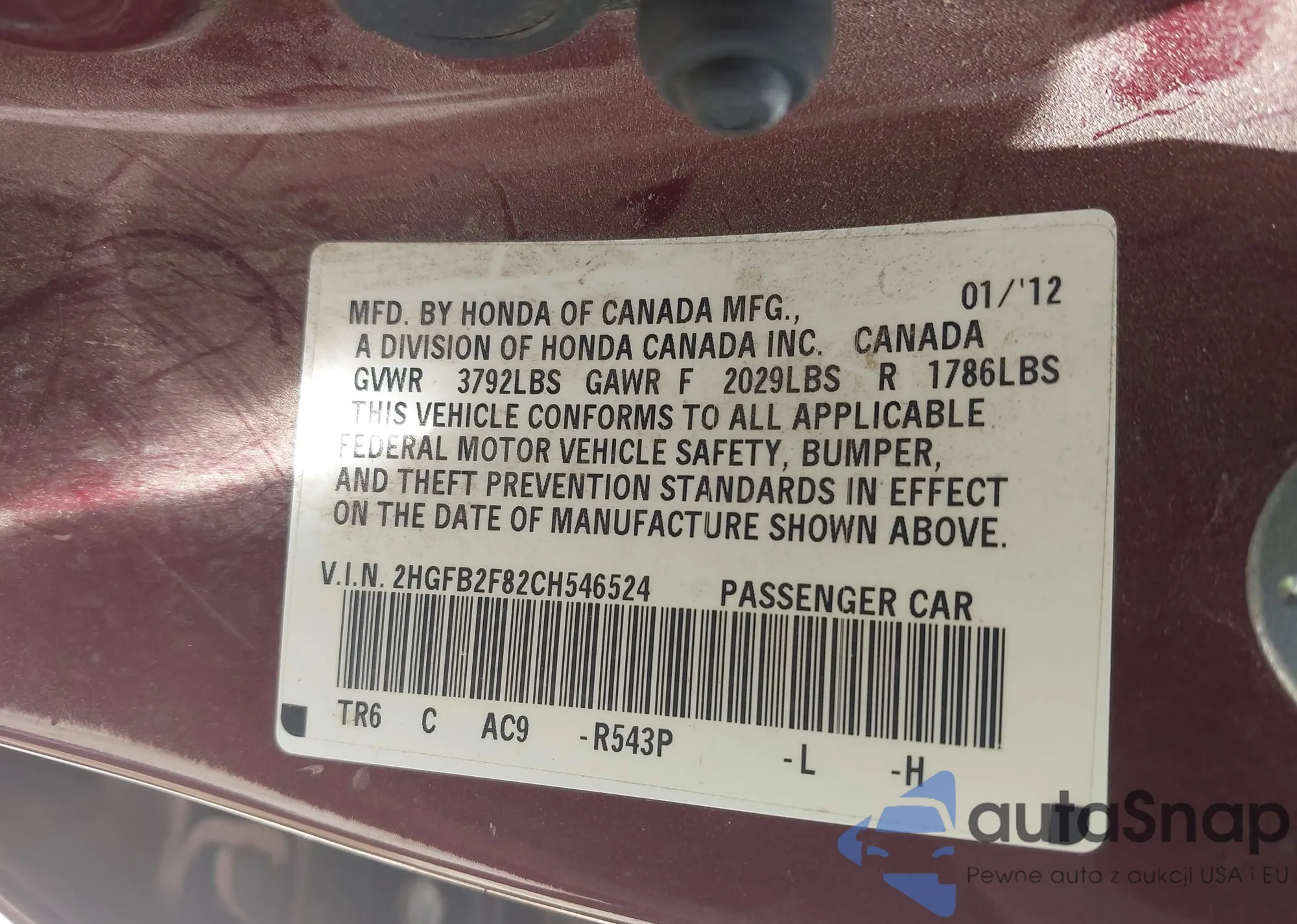 • VIN 2HGFB2F82CH546524