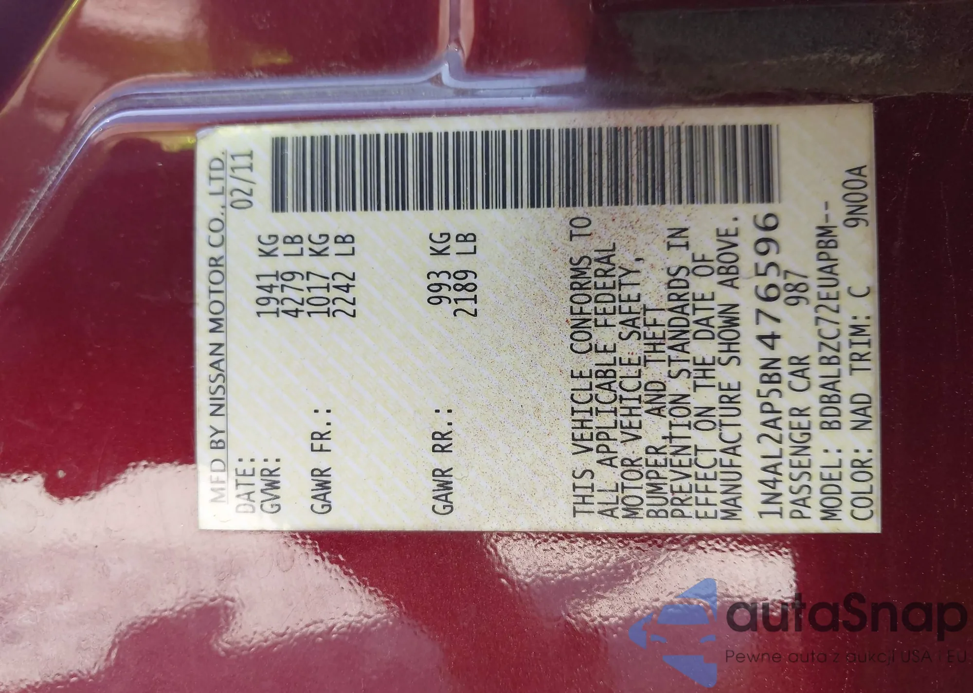 LOT: 42001142 VIN: 1N4AL2AP5BN476596
