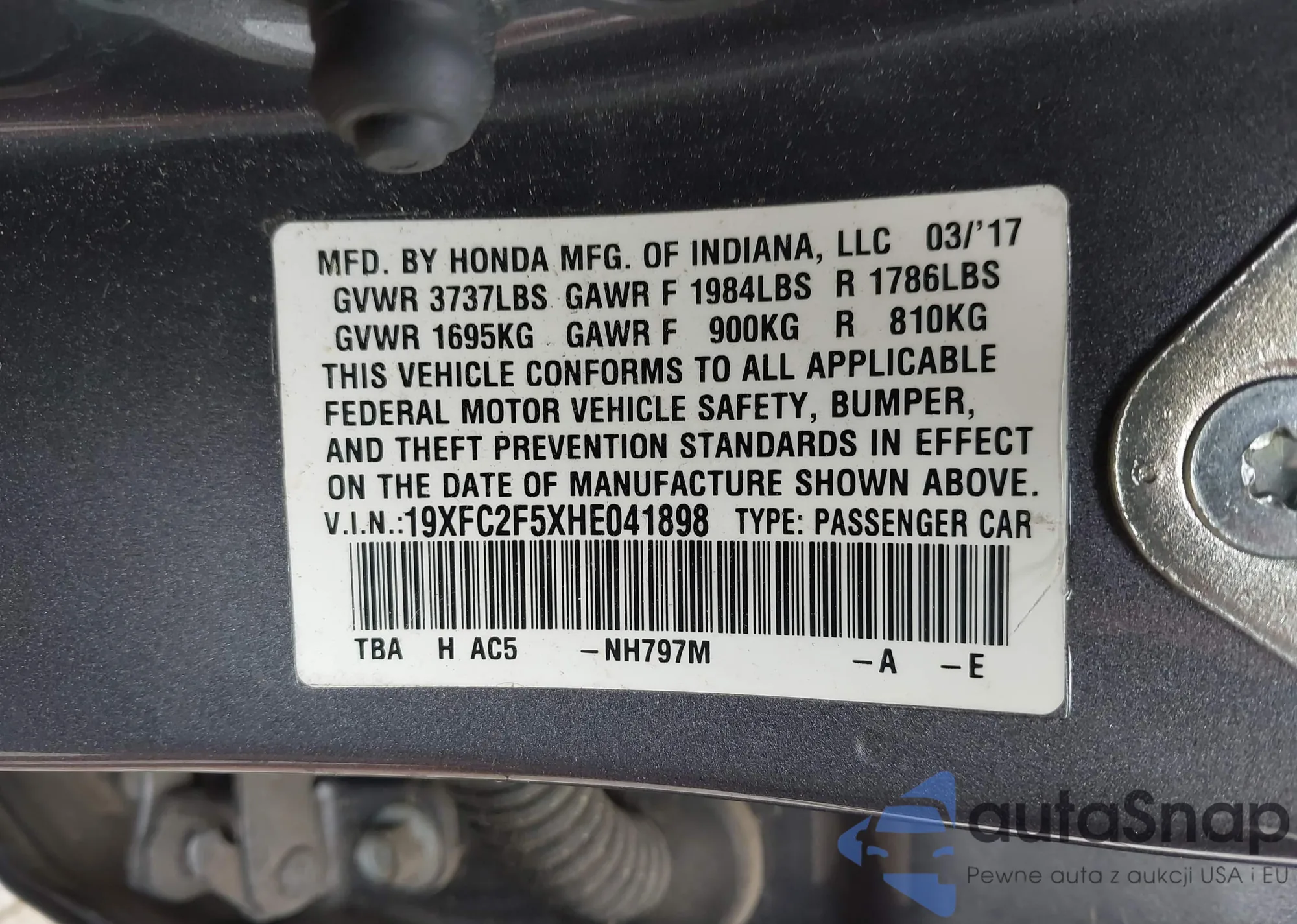 LOT: 42215491 VIN: 19XFC2F5XHE041898