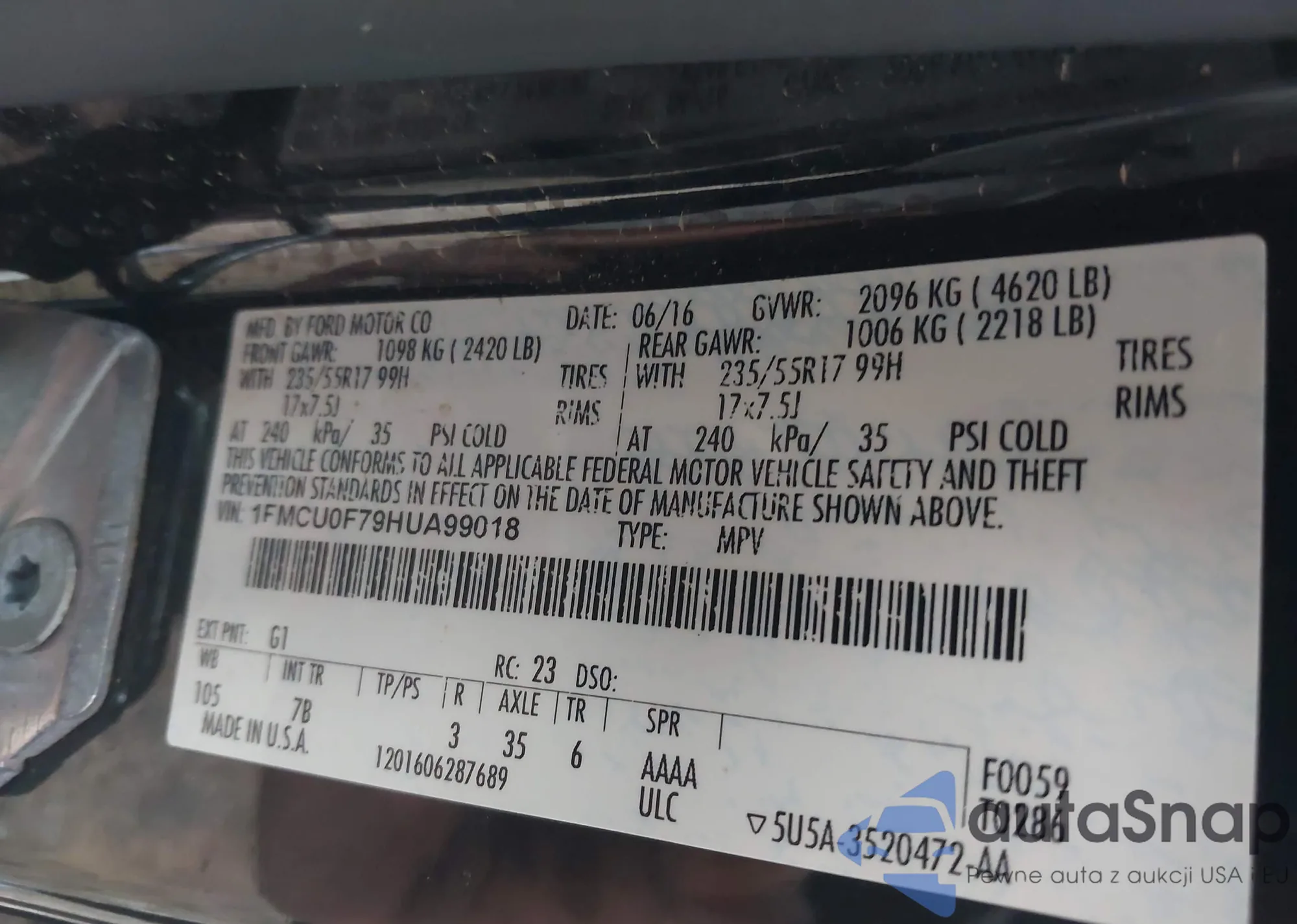 LOT: 42065037 VIN: 1FMCU0F79HUA99018