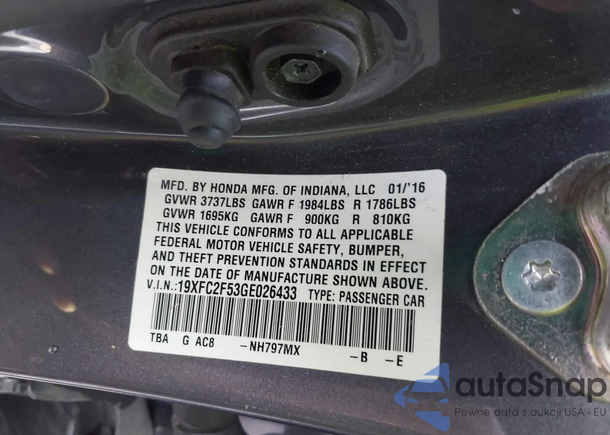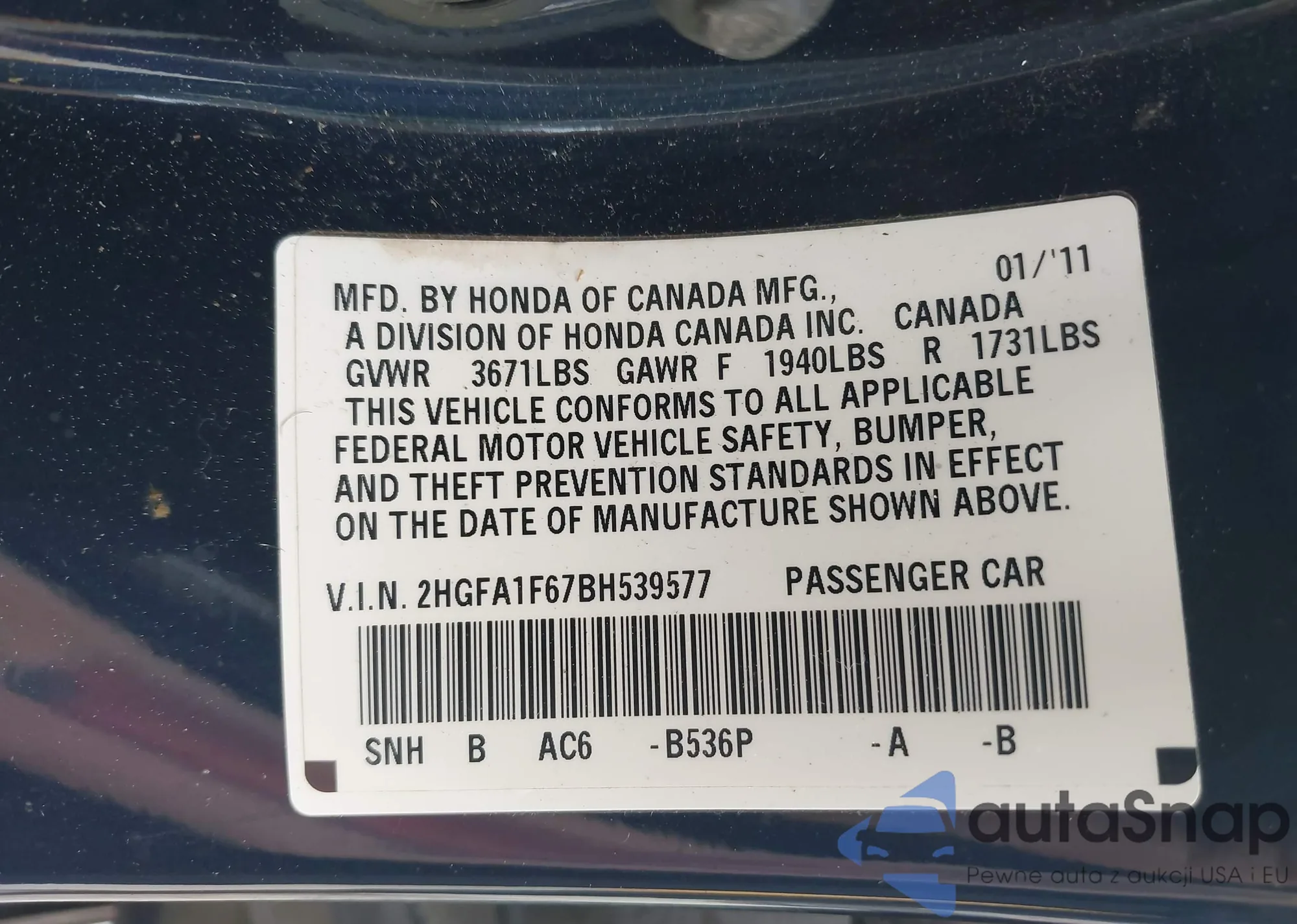 LOT: 42153053 VIN: 2HGFA1F67BH539577