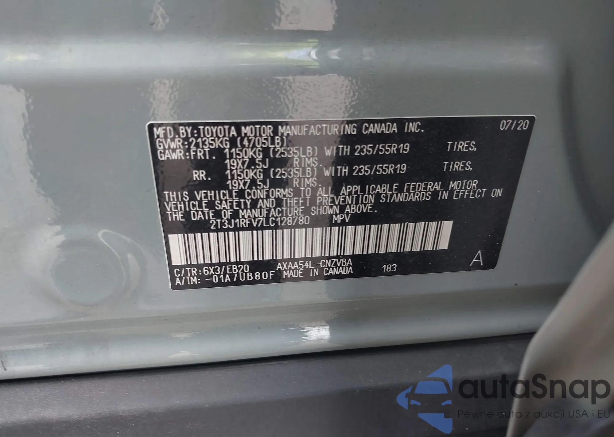 LOT: 42146795 VIN: 2T3J1RFV7LC128780