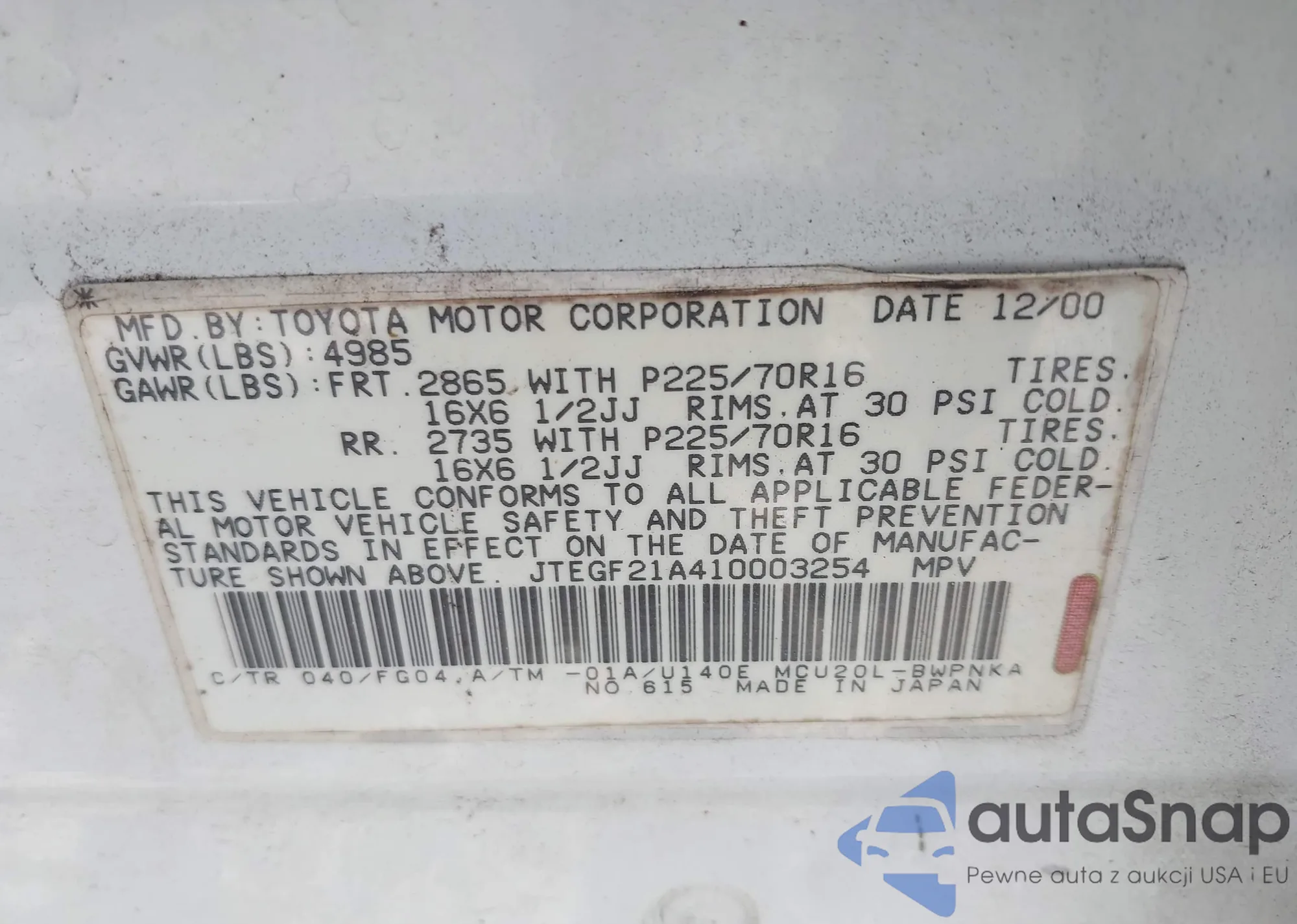 LOT: 42236975 VIN: JTEGF21A410003254