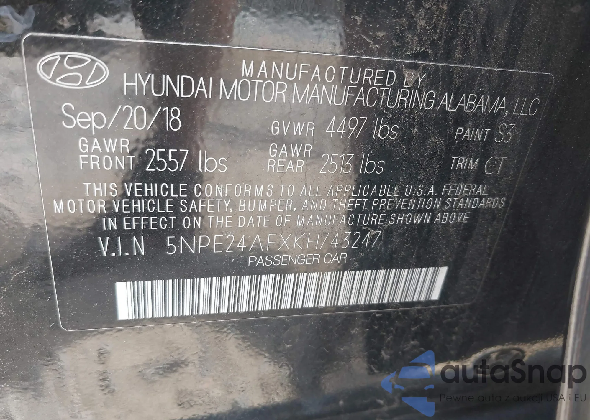 • VIN 5NPE24AFXKH743247