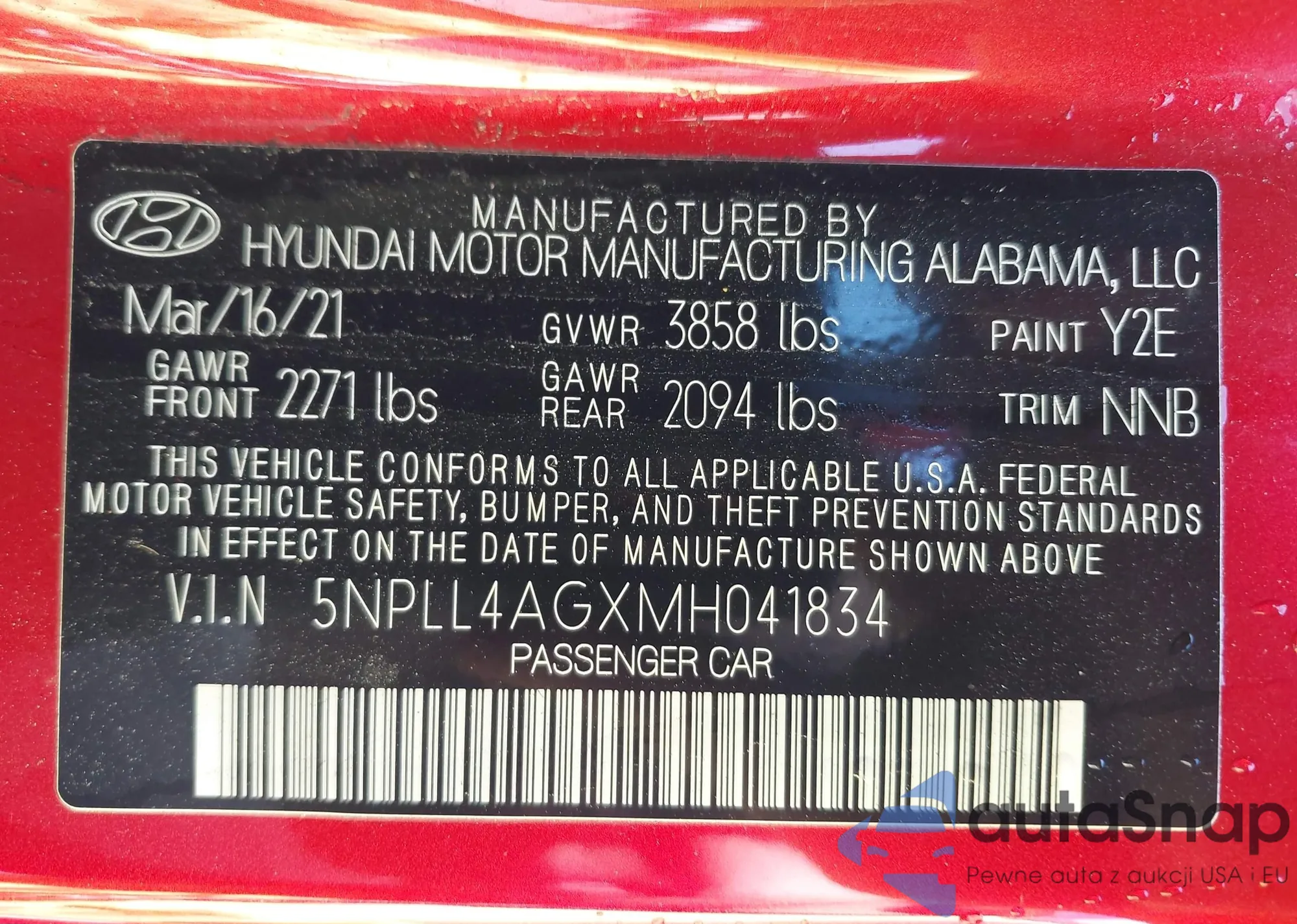 LOT: 42189772 VIN: 5NPLL4AGXMH041834