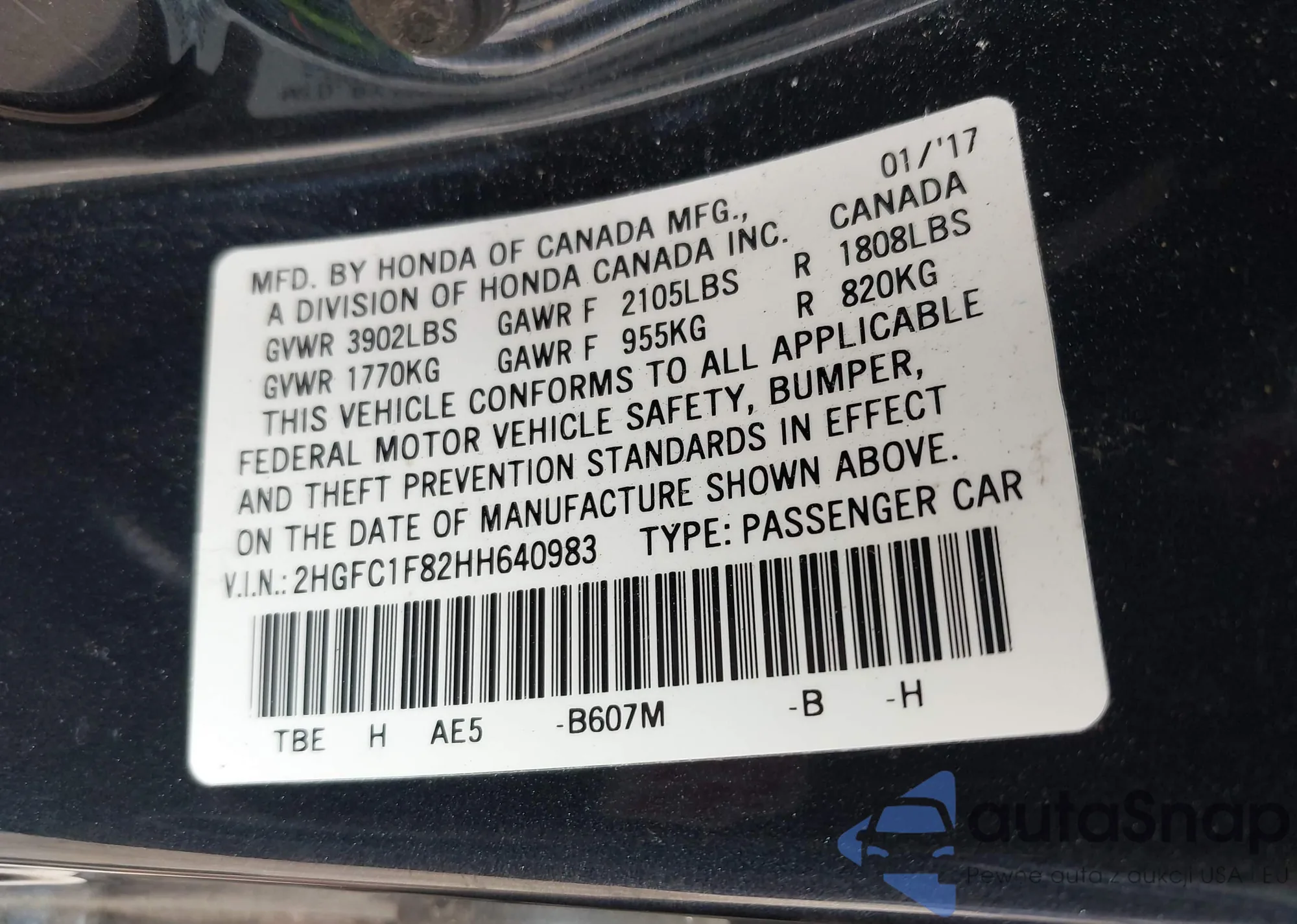 LOT: 42138983 VIN: 2HGFC1F82HH640983