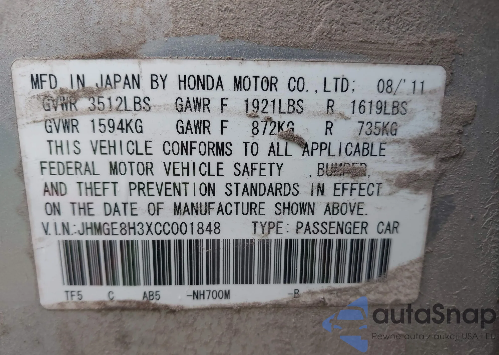 • VIN JHMGE8H3XCC001848