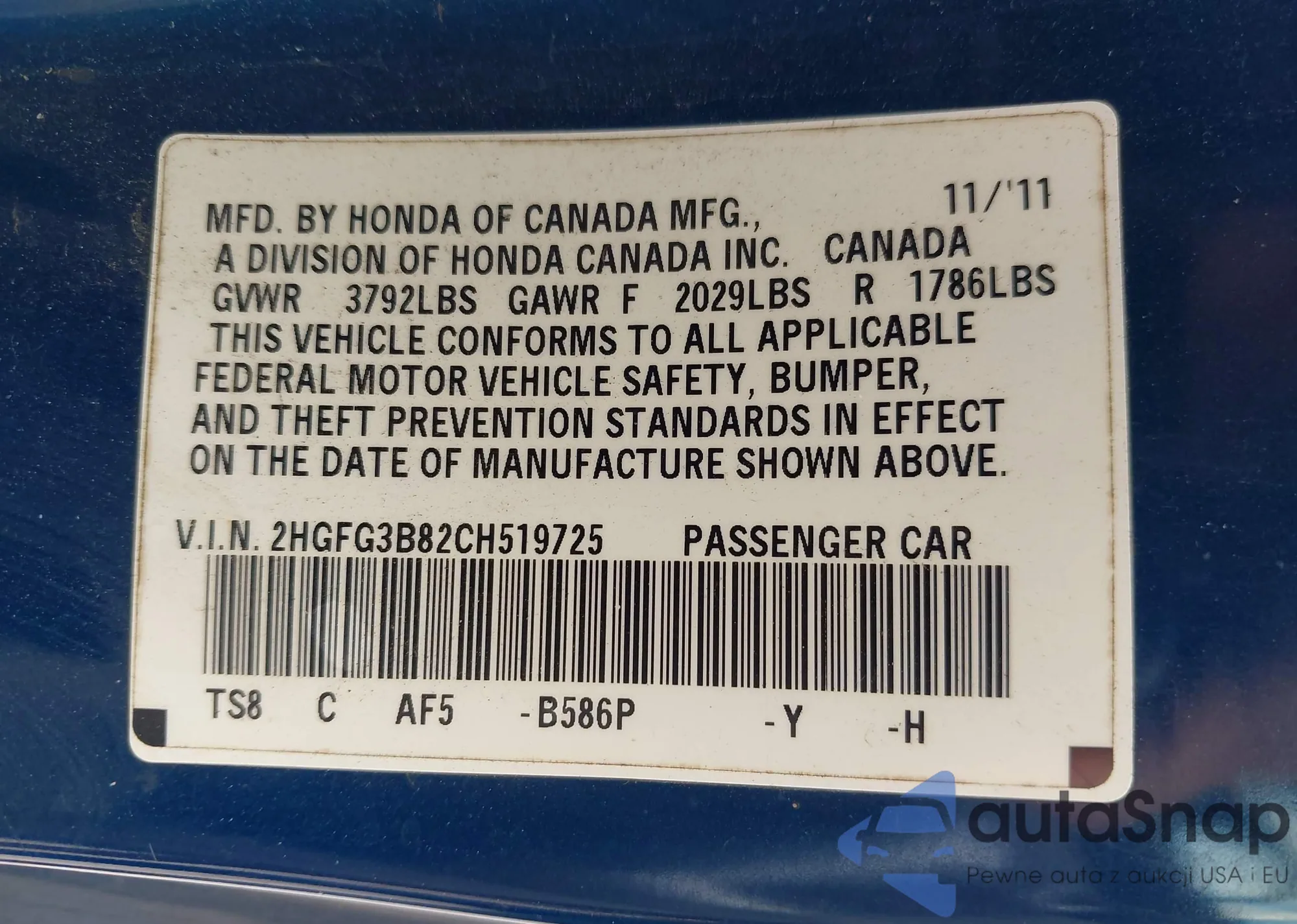 • VIN 2HGFG3B82CH519725
