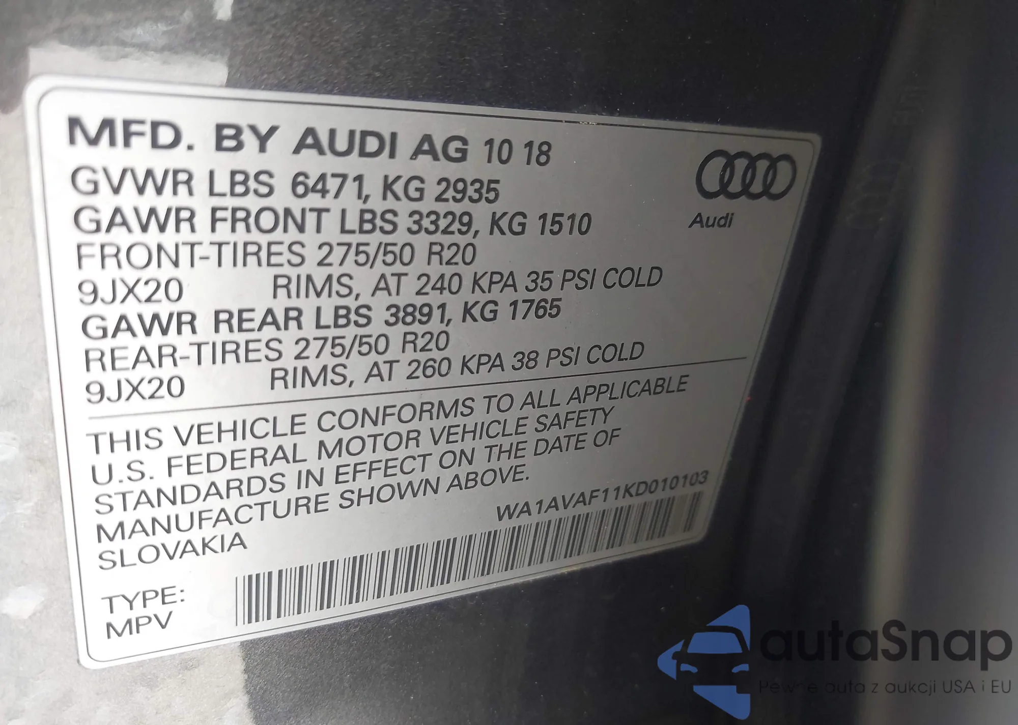 LOT: 42296348 VIN: WA1AVAF11KD010103