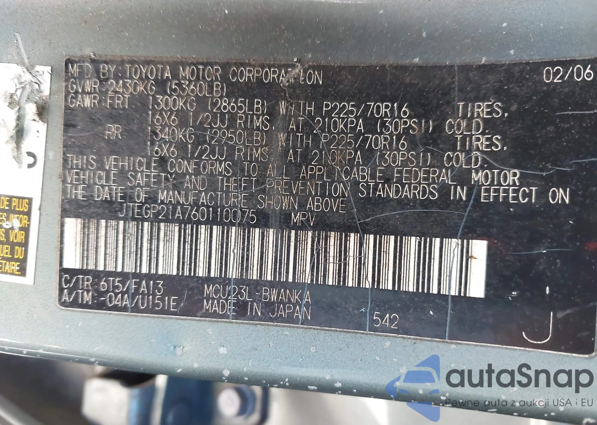 LOT: 41556328 VIN: JTEGP21A760110075