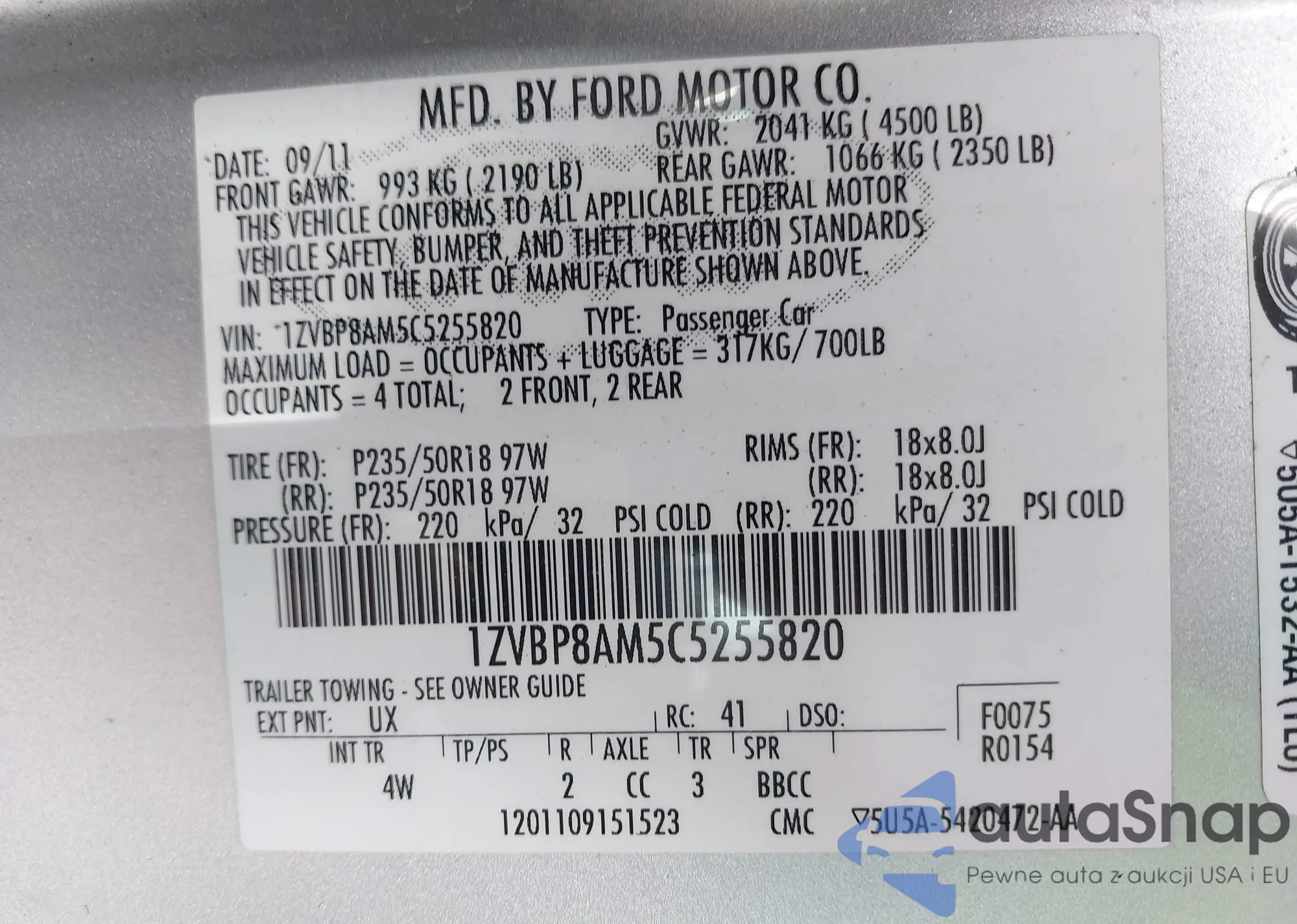 LOT: 41828948 VIN: 1ZVBP8AM5C5255820