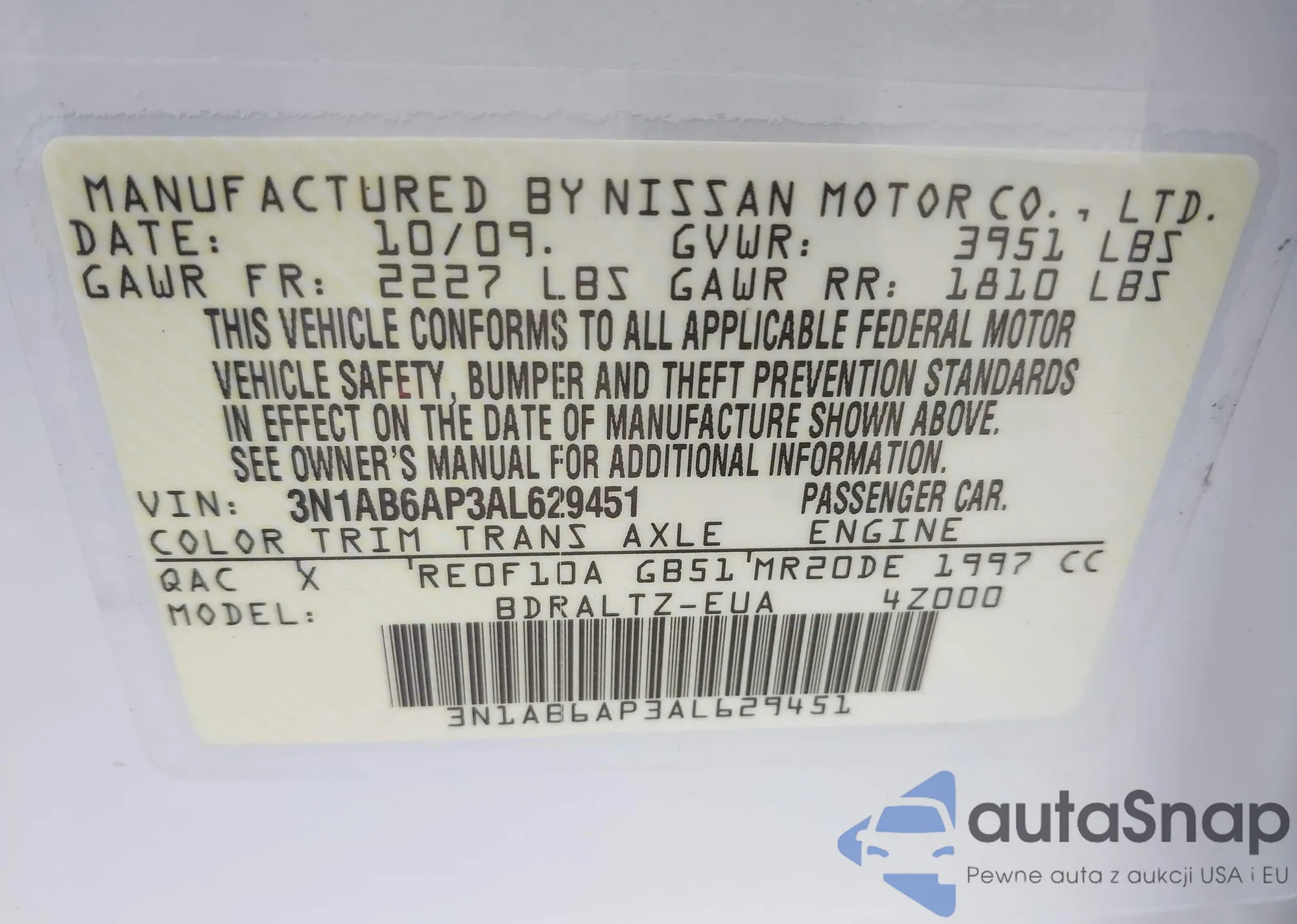 • VIN 3N1AB6AP3AL629451