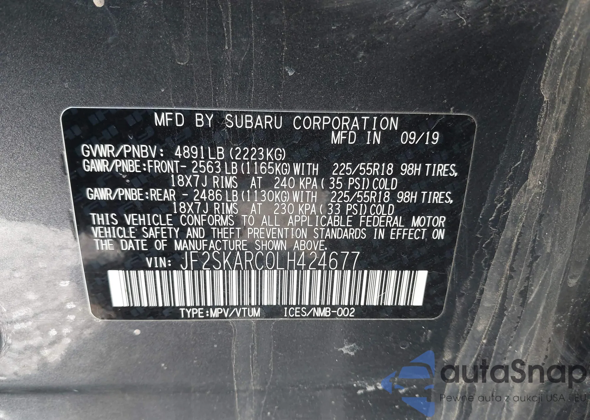 LOT: 41652327 VIN: JF2SKARC0LH424677