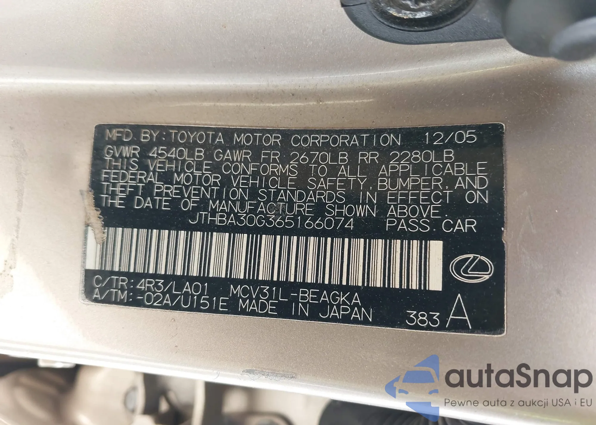 LOT: 41291013 VIN: JTHBA30G365166074