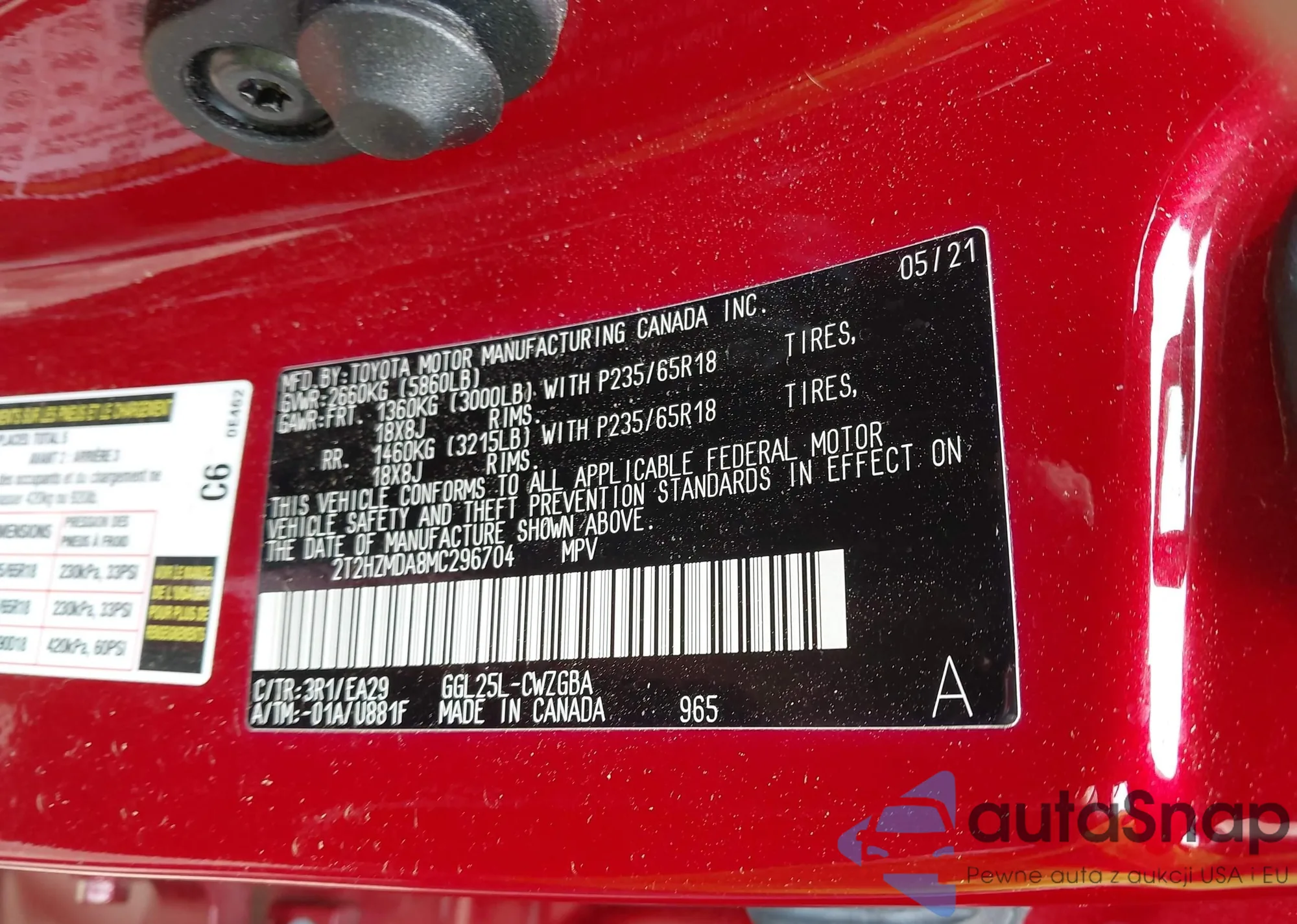 LOT: 41911893 VIN: 2T2HZMDA8MC296704
