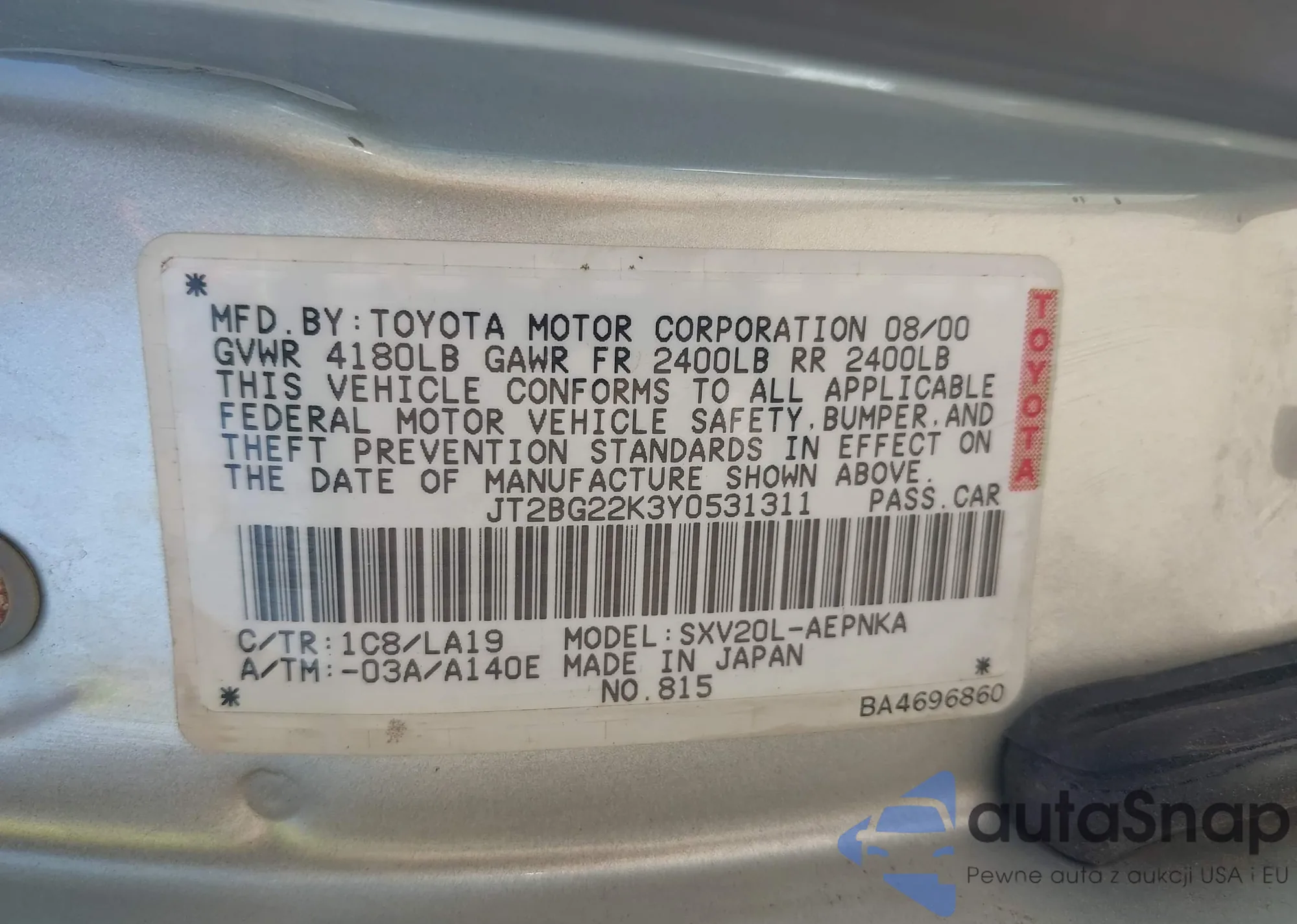 LOT: 42278681 VIN: JTEBT14R830006630