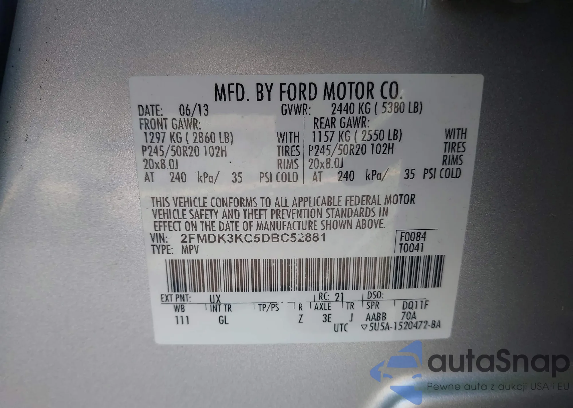 LOT: 42149059 VIN: 2FMDK3KC5DBC52881
