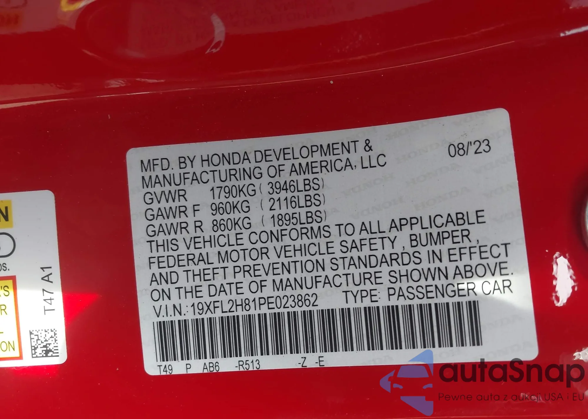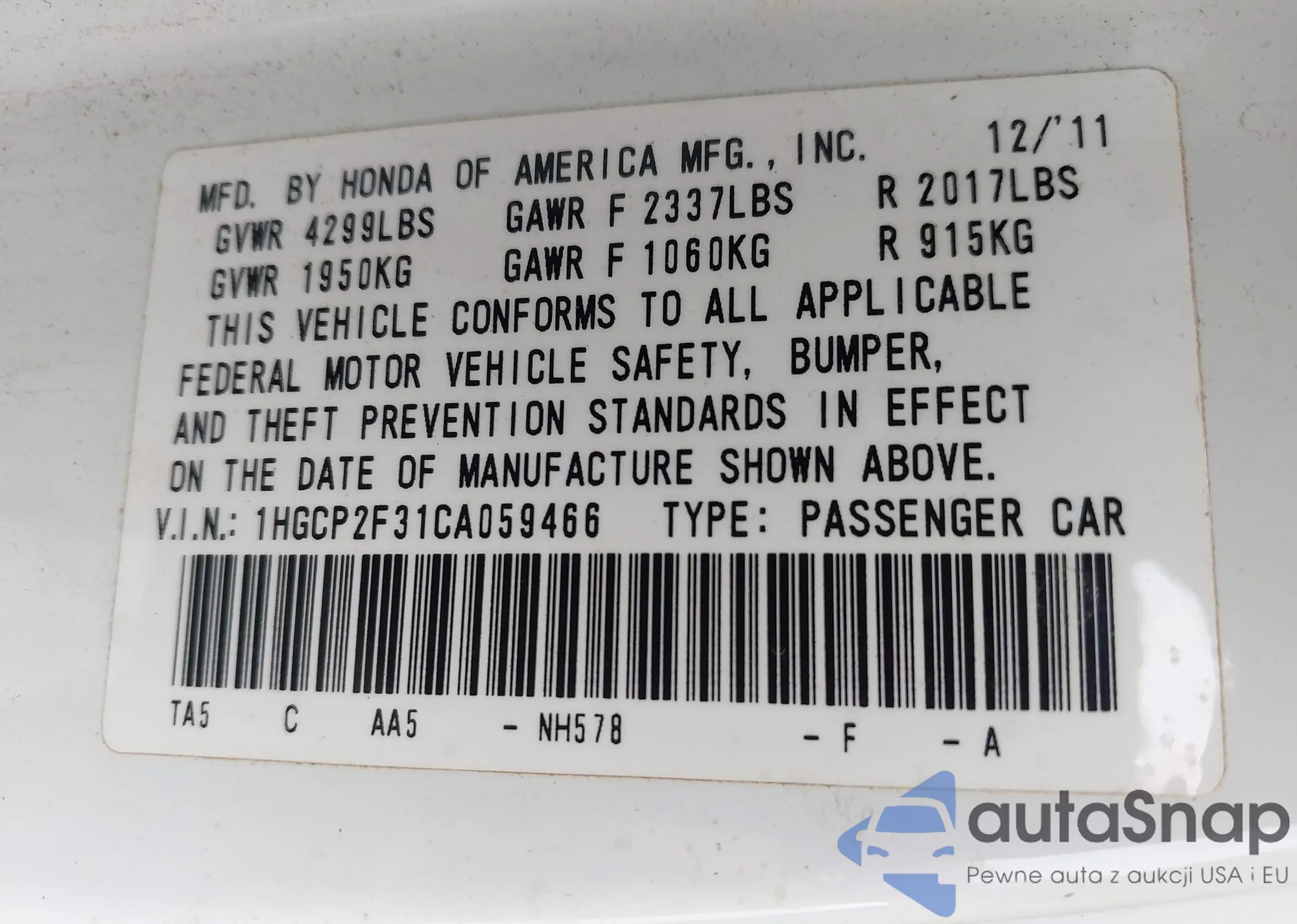 LOT: 42268038 VIN: 1HGCP2F31CA059466