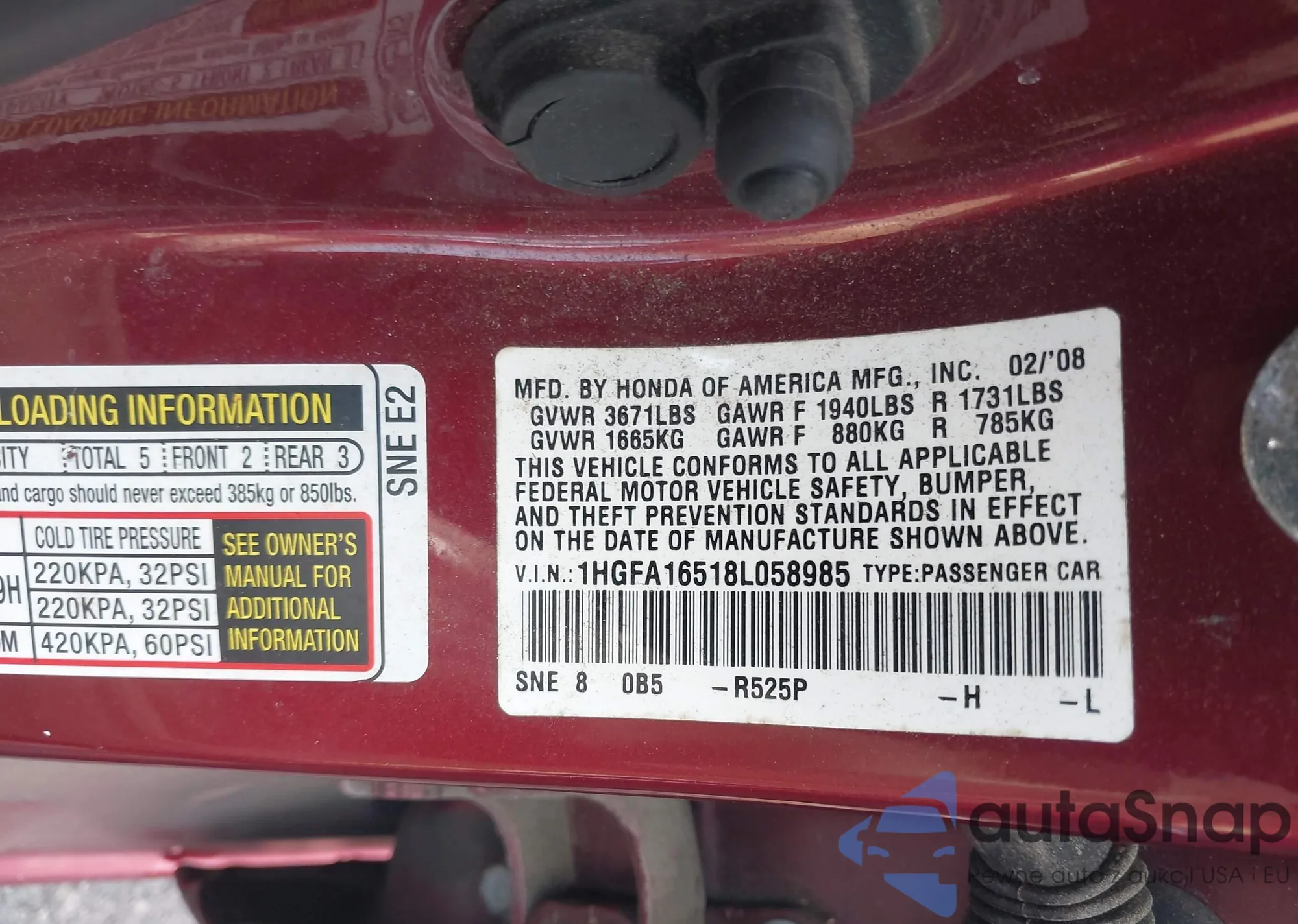 • VIN 1HGFA16518L058985
