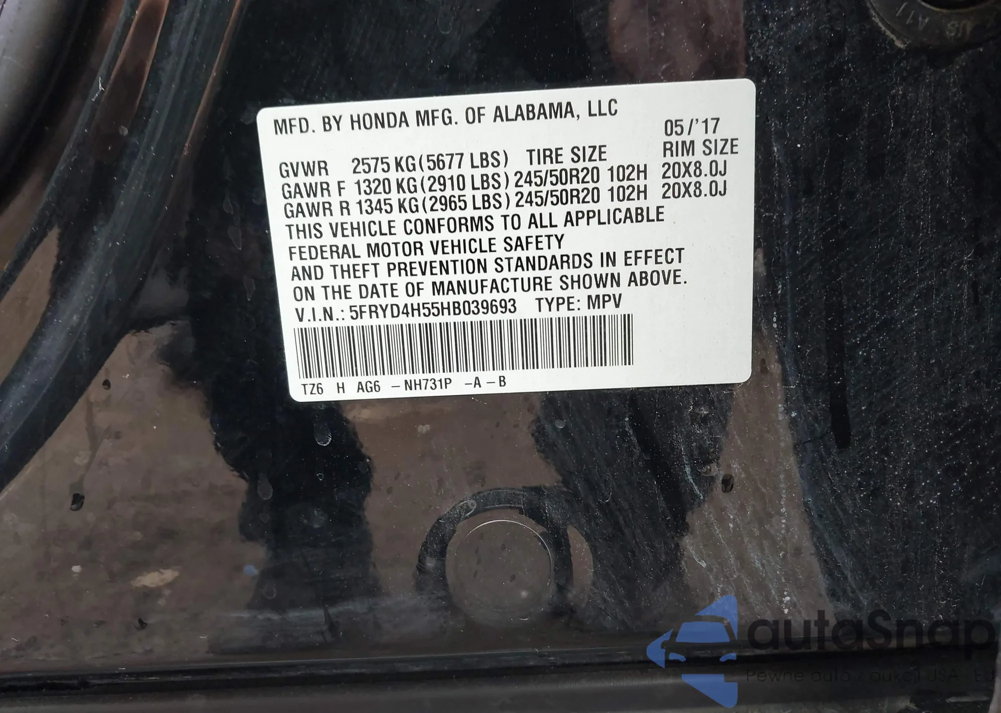 • VIN 5FRYD4H55HB039693