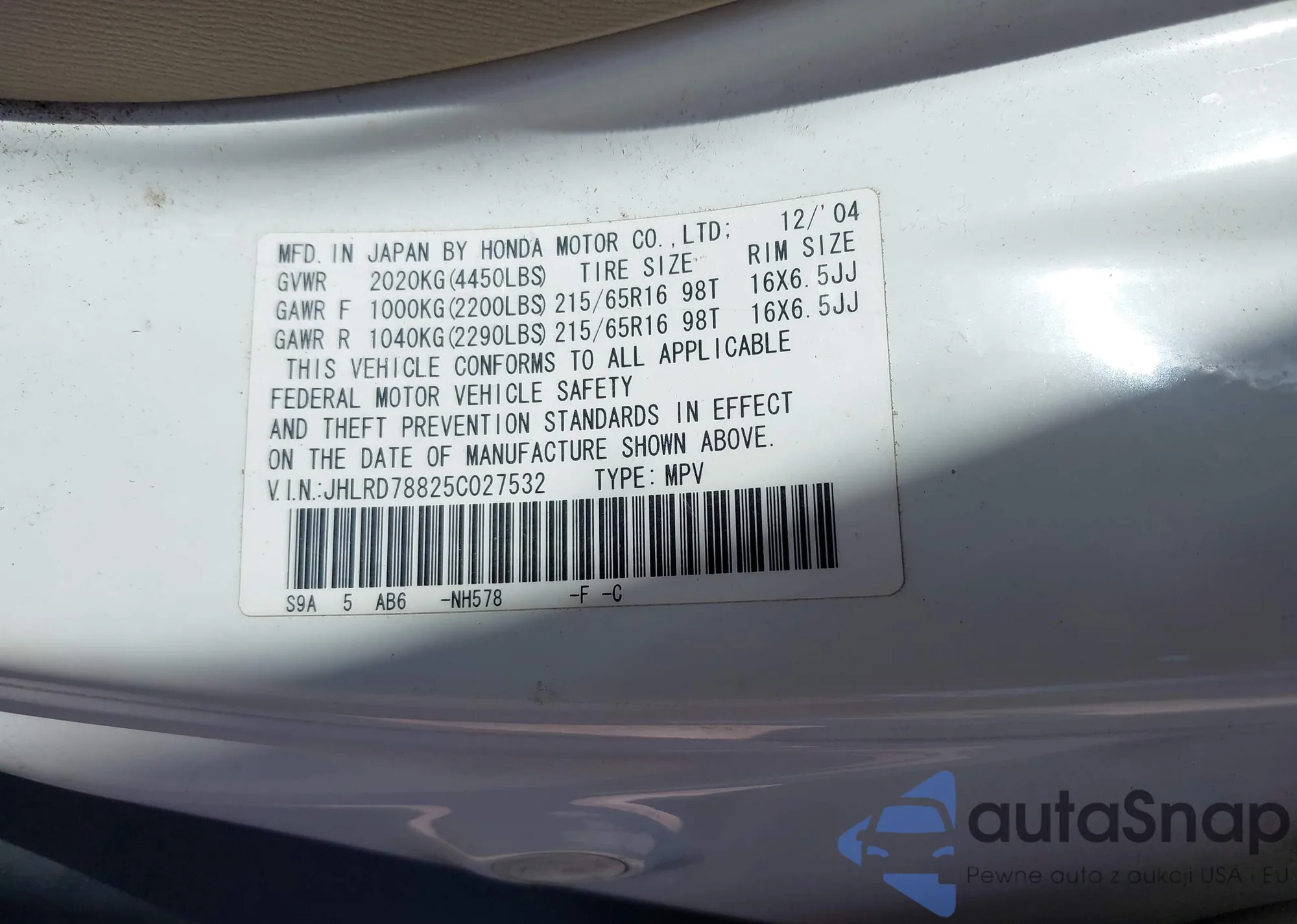 • VIN JHLRD78825C027532