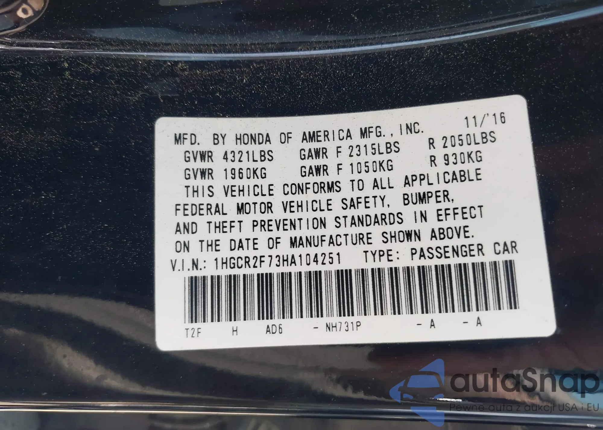 LOT: 41999603 VIN: 1HGCR2F73HA104251