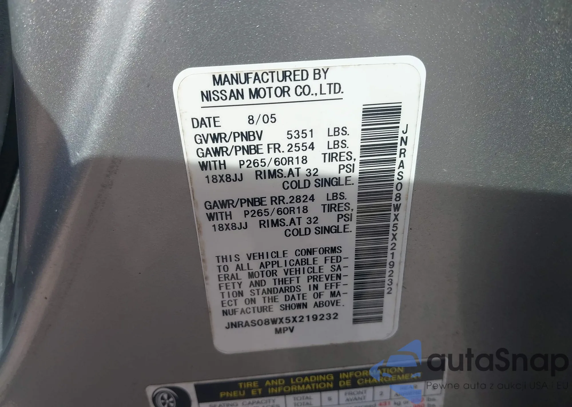 LOT: 41945560 VIN: JNRAS08WX5X219232
