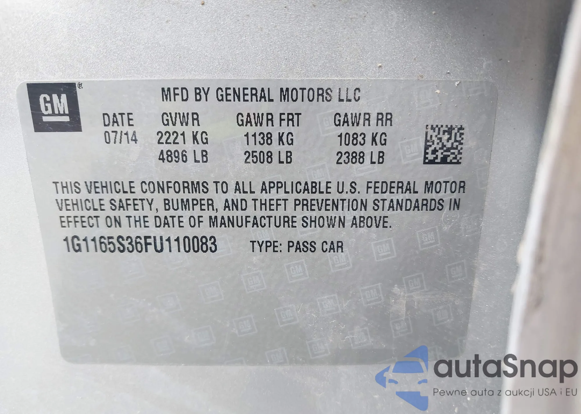 LOT: 42207318 VIN: 1G1165S36FU110083