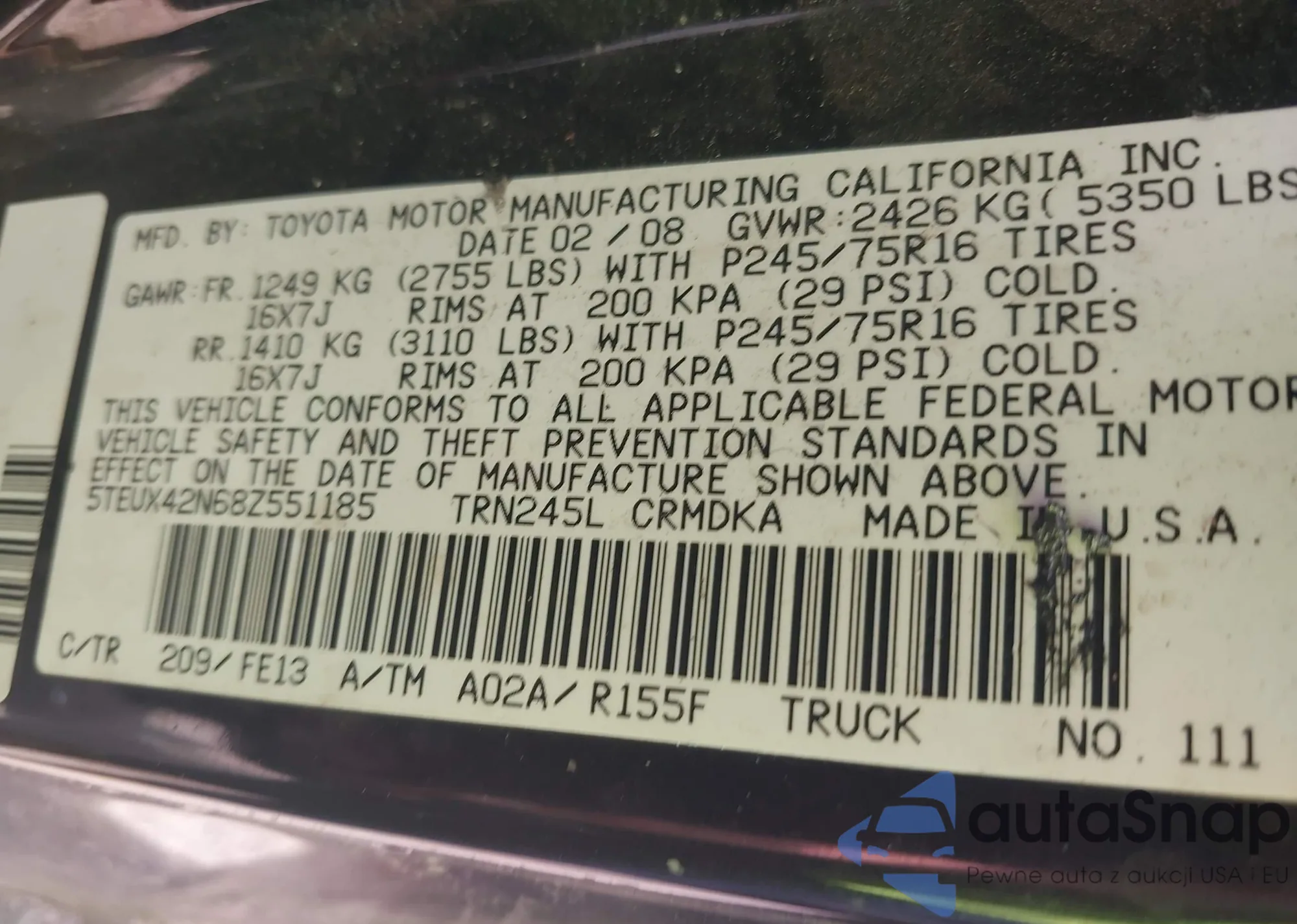 • VIN 5TEUX42N68Z551185
