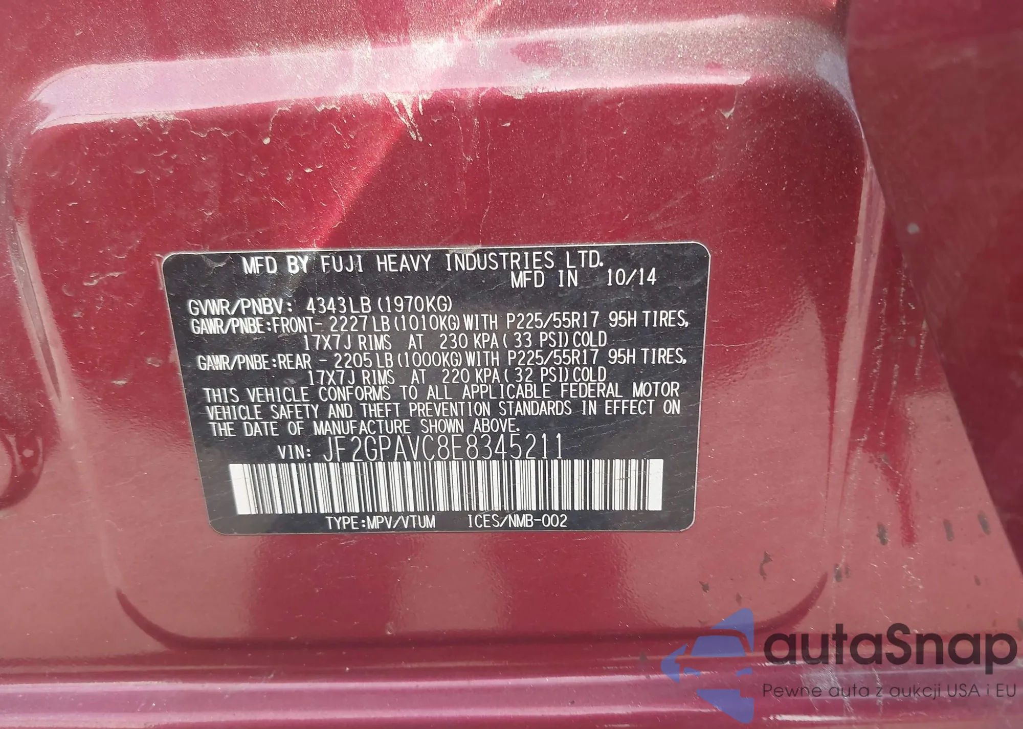 LOT: 42207411 VIN: JF2GPAVC8E8345211
