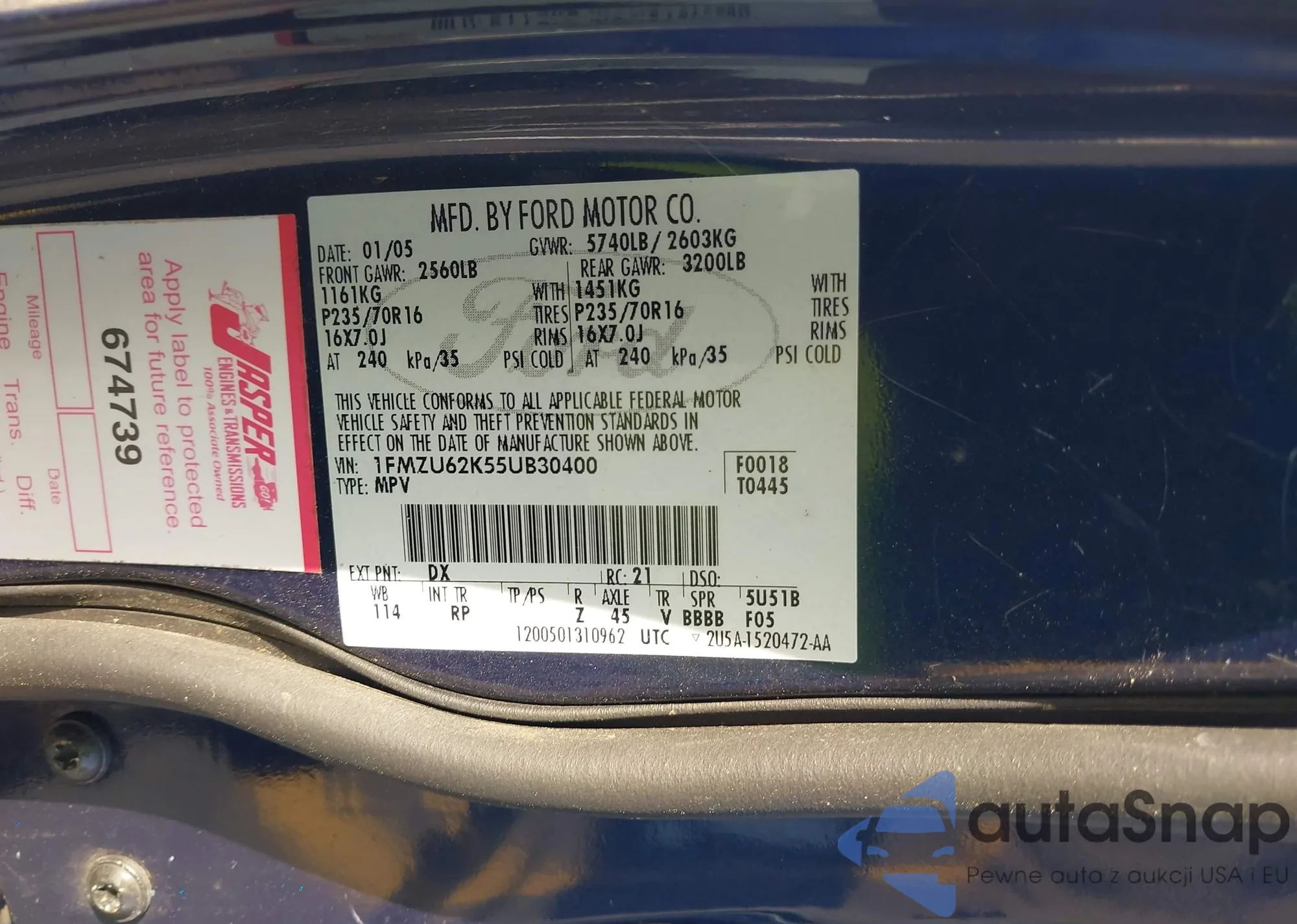 • VIN 1FMZU62K55UB30400