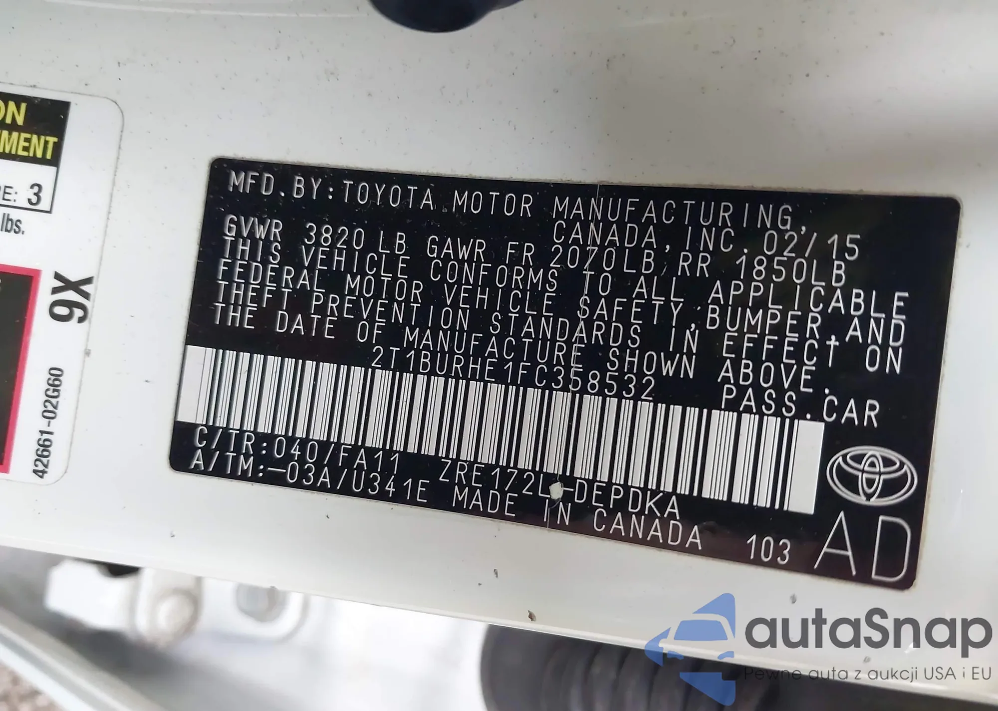 LOT: 42350880 VIN: 2T1BURHE1FC358532