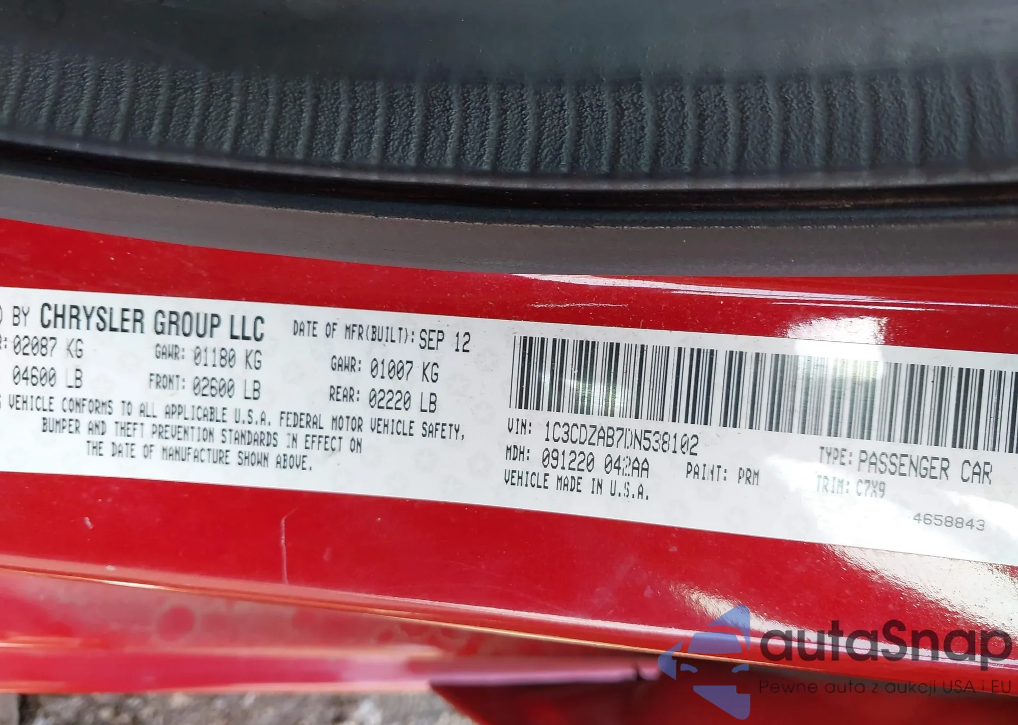 LOT: 42432958 VIN: 1C3CDZAB7DN538102