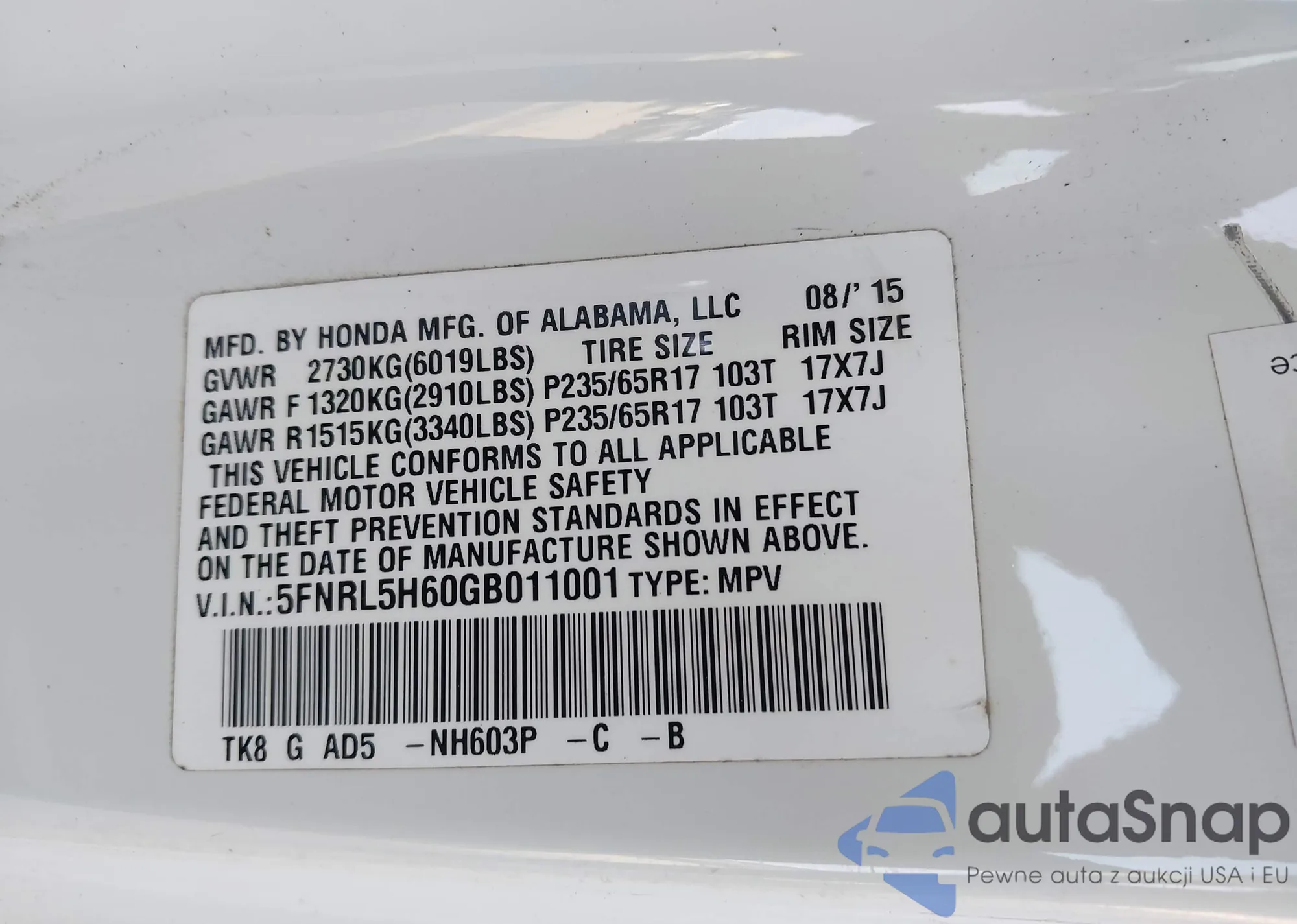 • VIN 5FNRL5H60GB011001