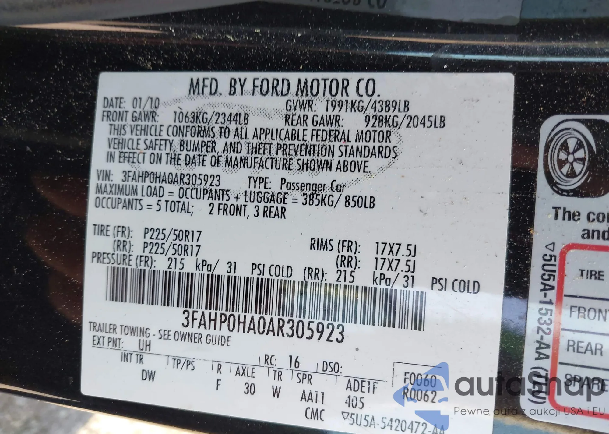 • VIN 3FAHP0HA0AR305923