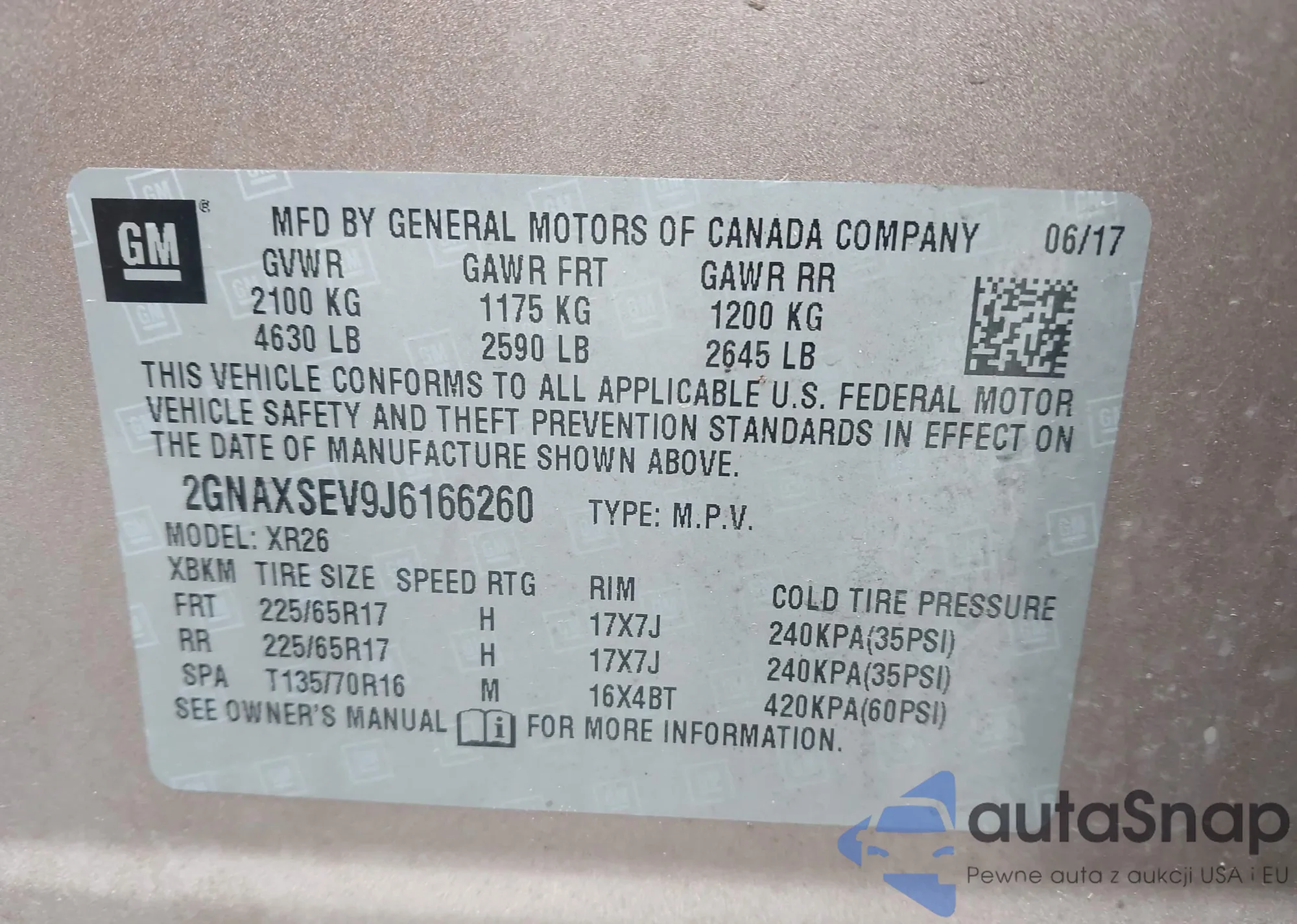 LOT: 42215988 VIN: 2GNAXSEV9J6166260