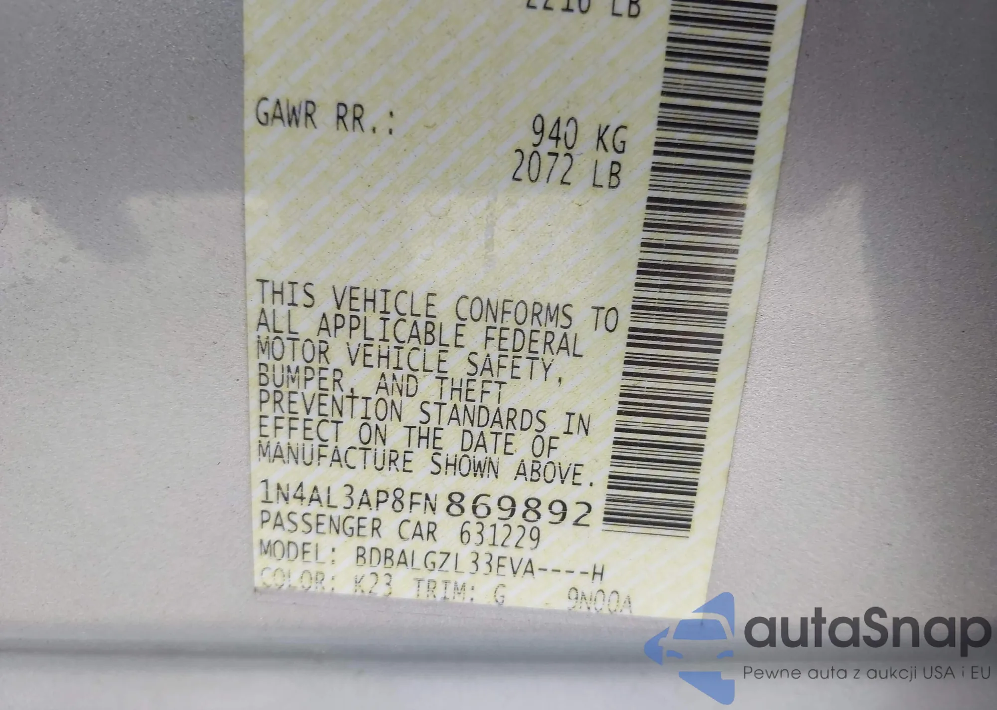 LOT: 42224337 VIN: 1N4AL3AP8FN869892
