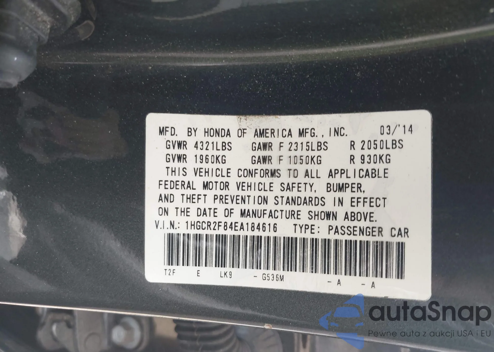 LOT: 42102276 VIN: 1HGCR2F84EA184616