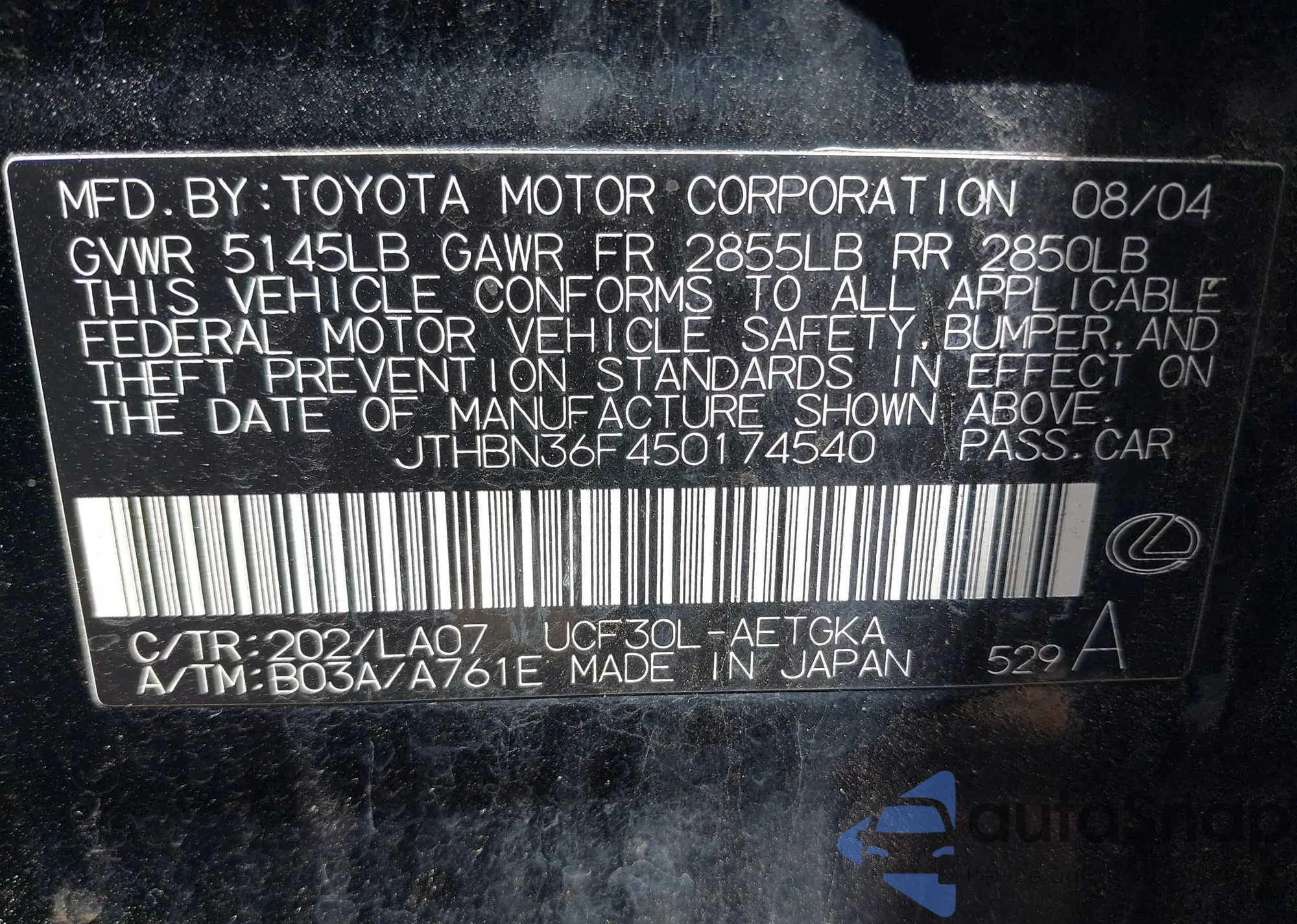 LOT: 42127938 VIN: JTHBN36F450174540