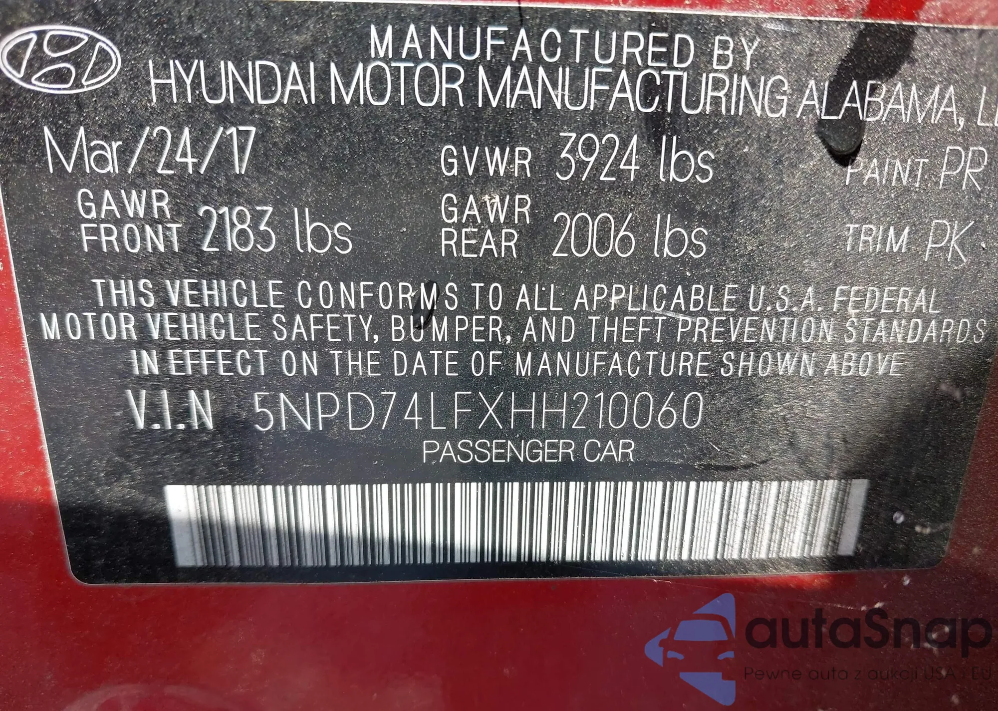 LOT: 42160473 VIN: 5NPD74LFXHH210060