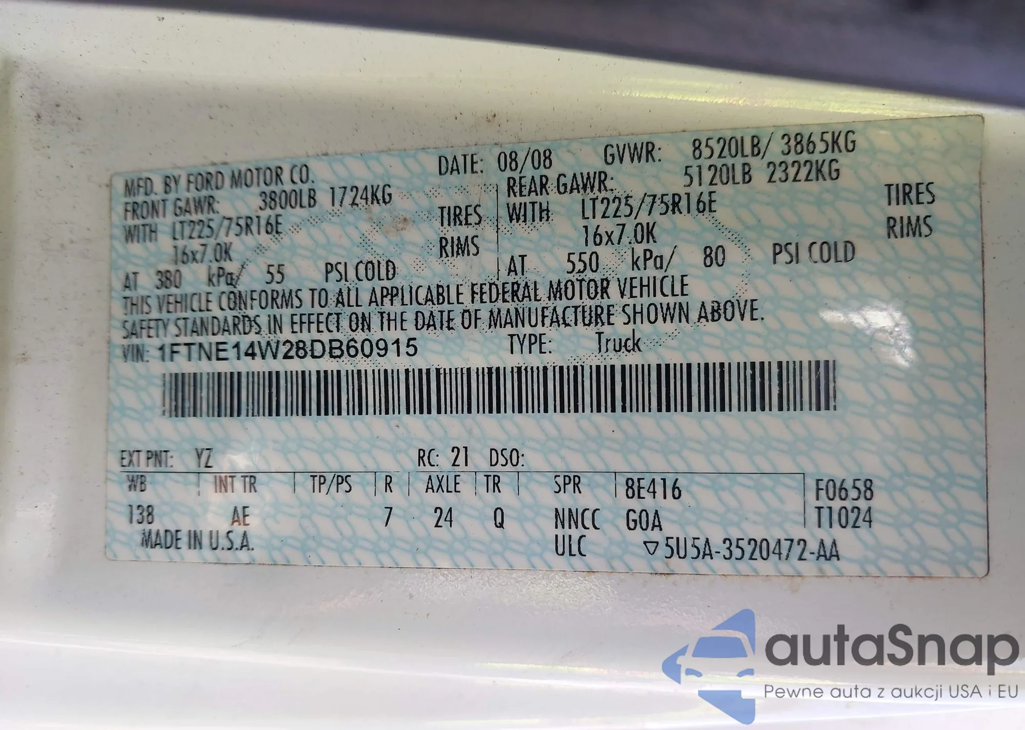 LOT: 42262551 VIN: 1FTNE14W28DB60915