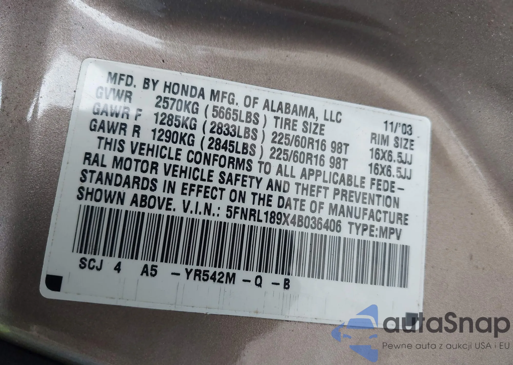 • VIN 5FNRL6H64RB024021