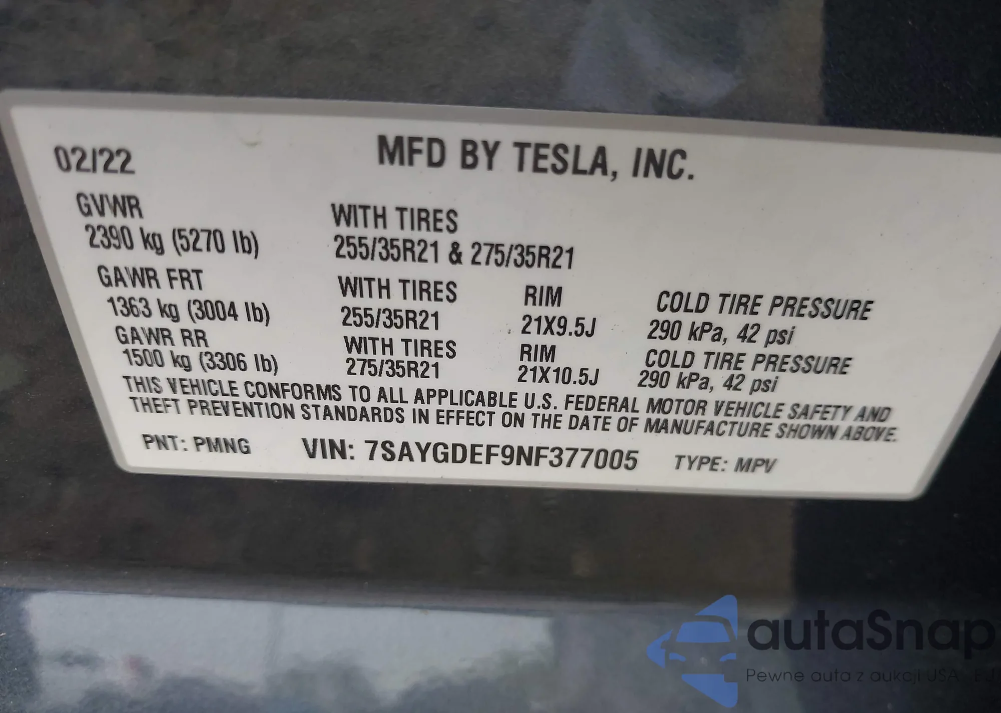 • VIN 7SAYGDEF9NF377005
