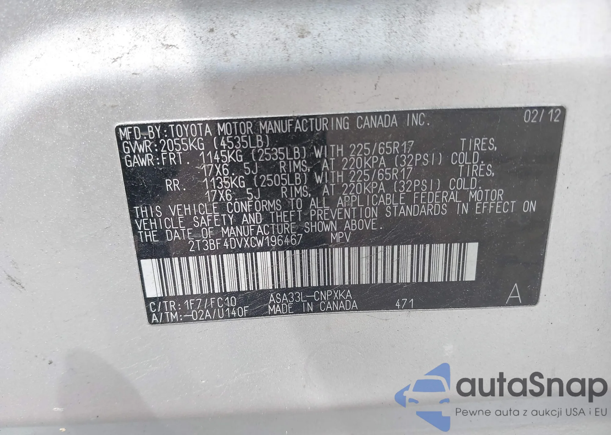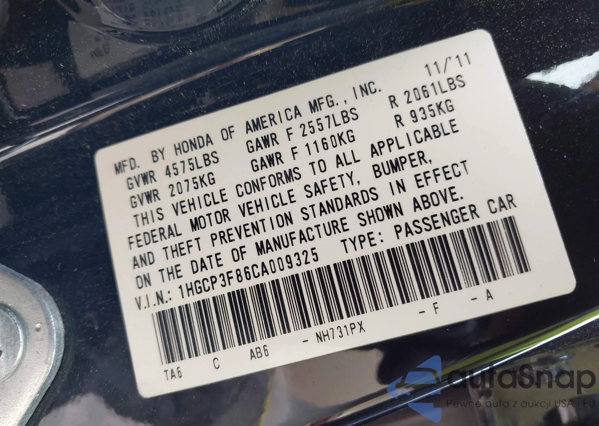 LOT: 42127124 VIN: 1HGCP3F86CA009325