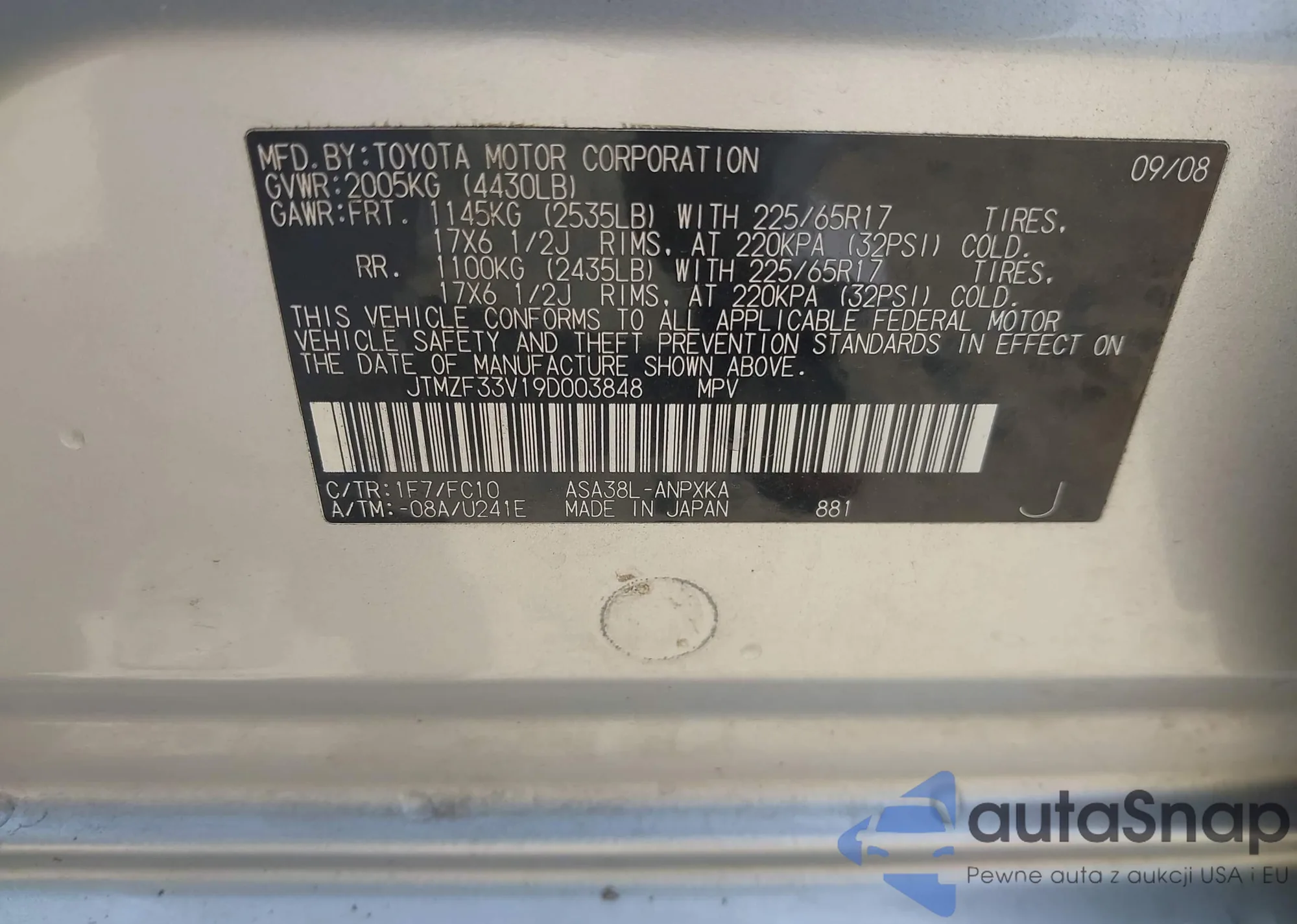 LOT: 42230899 VIN: JTMZF33V19D003848